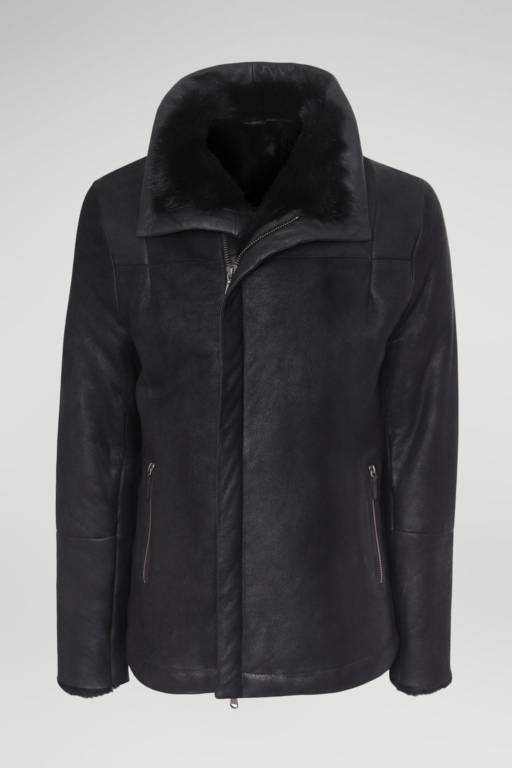 Shearling leather jacket with open wide zipped high collar. Zipper welt pockets on both sides. Shearling inside. Front zip closure. Soft-touch.