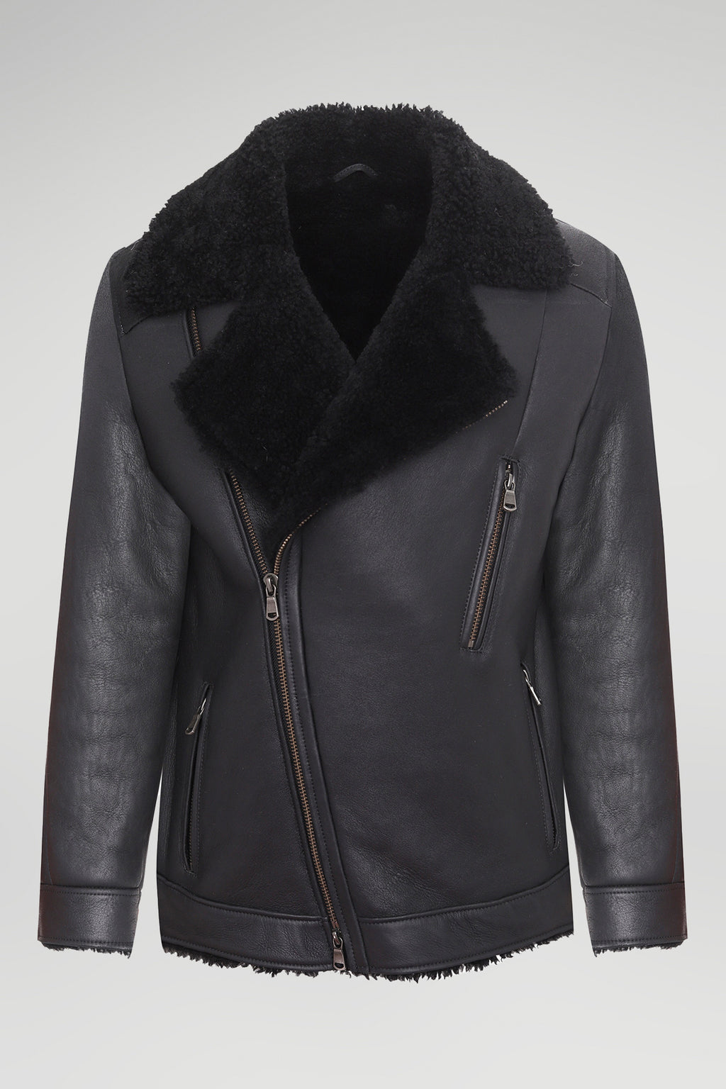 Shearling leather jacket with notched lapel. Shearling interior and collar. Asymmetrical zip closure. Front zip pockets and one chest pocket. Soft-touch.