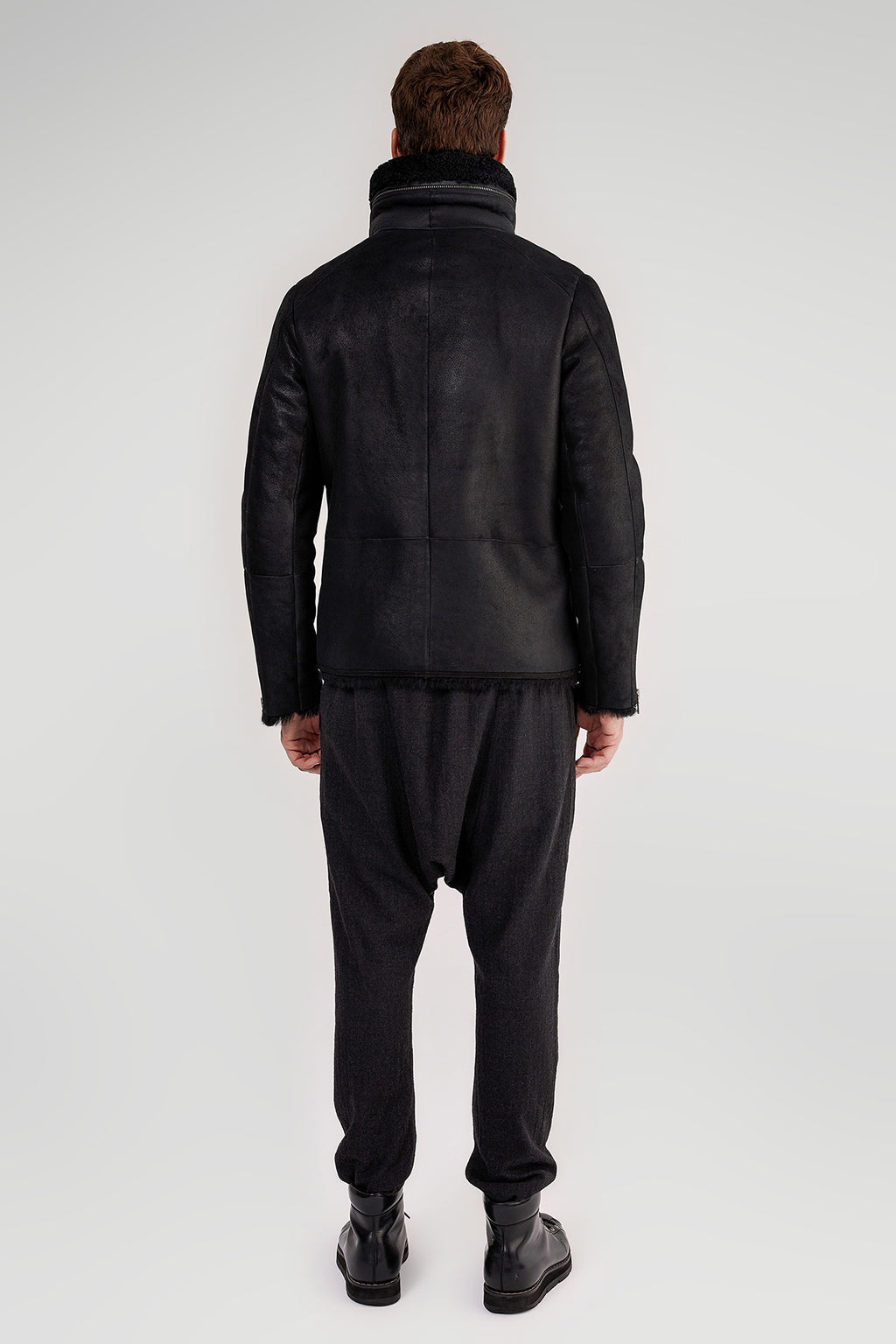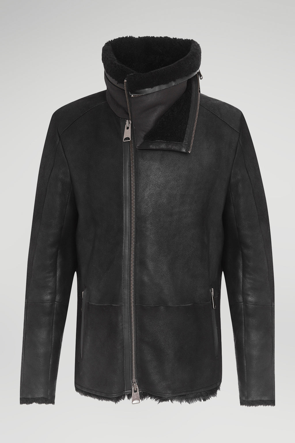 Shearling leather jacket with double zipper collar. Long sleeves with zip cuffs. Front zip pockets. Shearling interior. Front zip closure. Soft-touch.