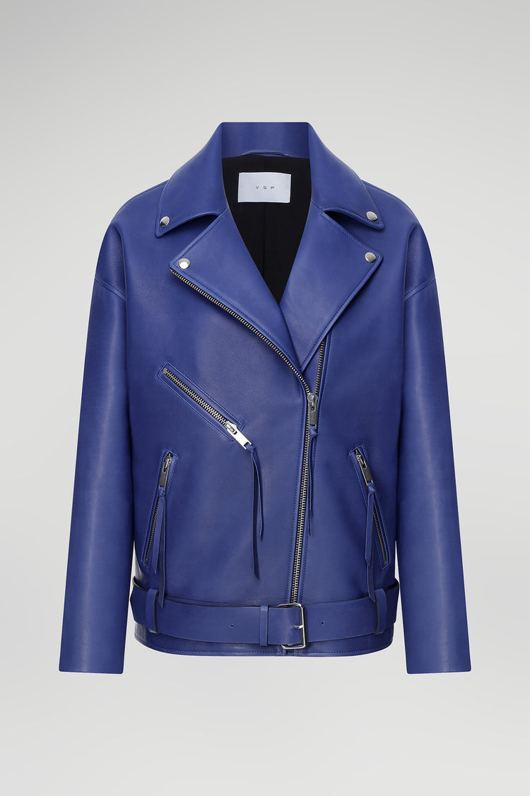 • This 'Gisele' jacket has a classic biker silhouette with silver hardware, zipped pockets and adjustable belt. The full lining ensures smooth layering. Oversize biker jacket, never looked so cool.