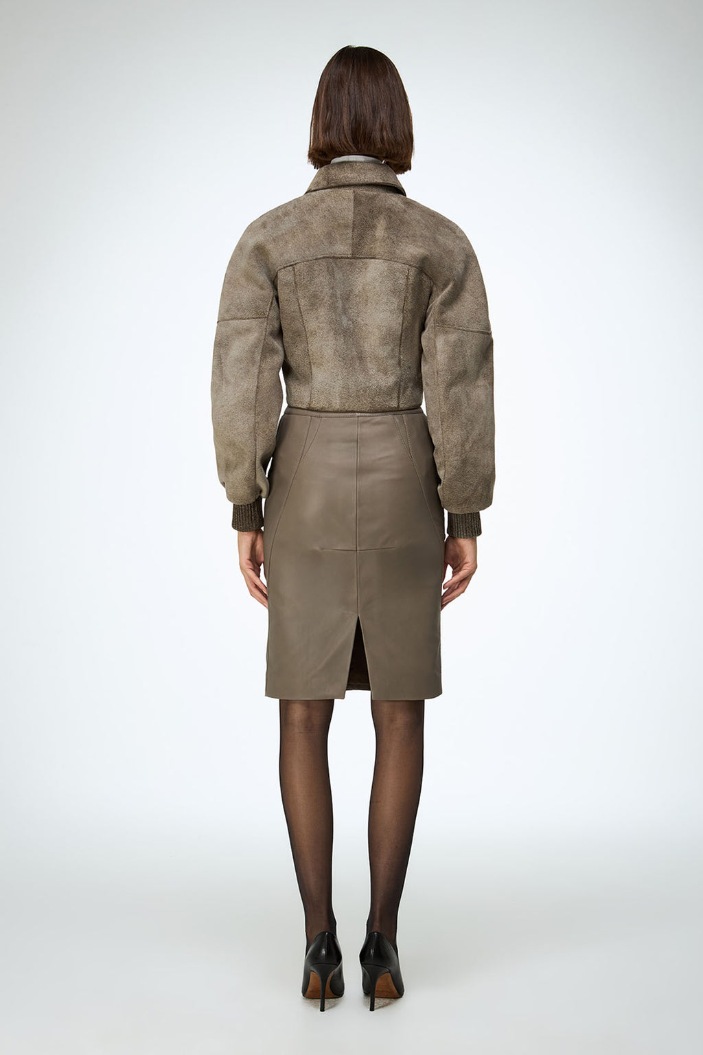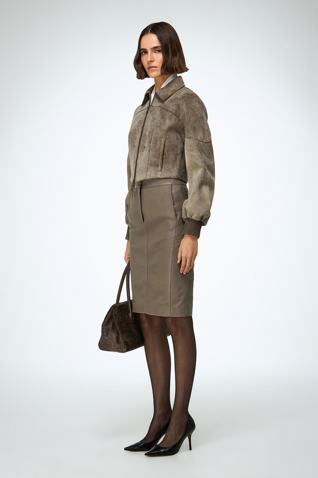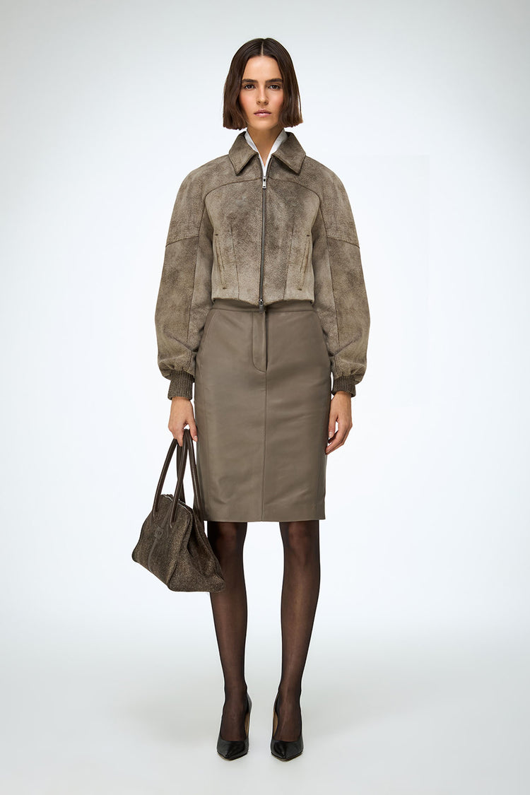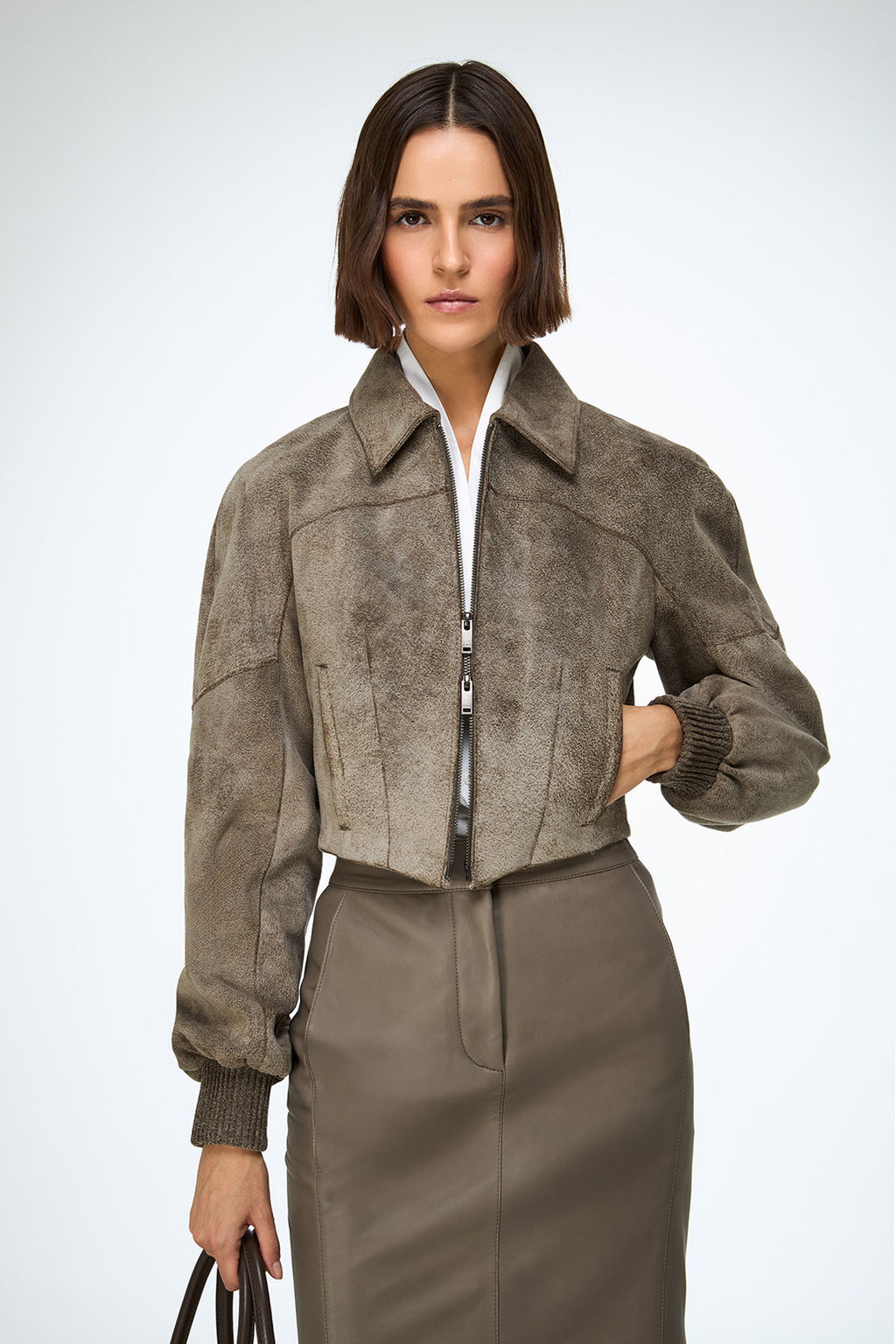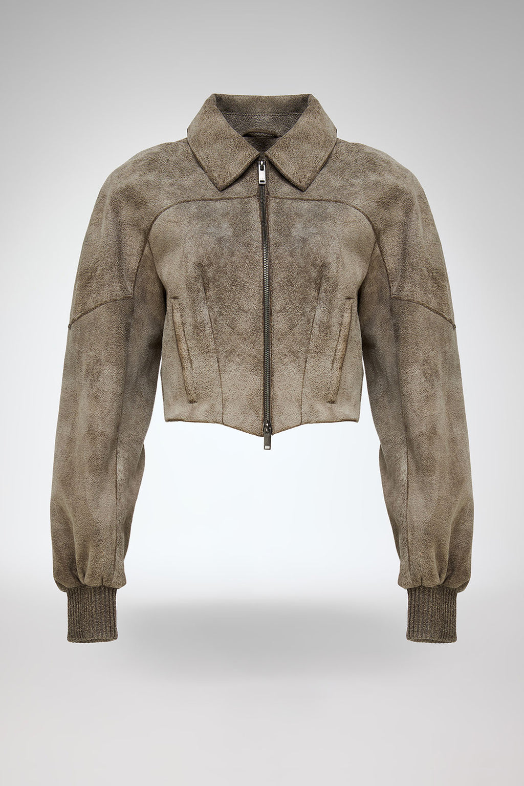 Super-cropped shirt-collar leather jacket with a double-sided distressed vintage-effect finish. Features side pockets, elasticated cuffs for a sporty touch, and a V-shaped front hemline.