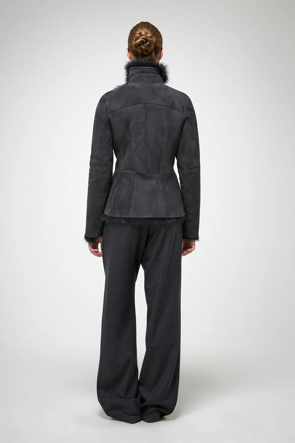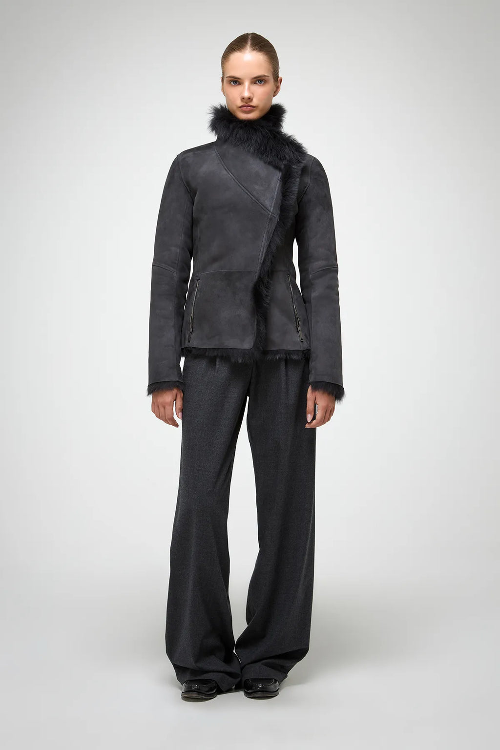 Fitted shearling jacket with crossover asymmetrical concealed zipper closure and side pockets.