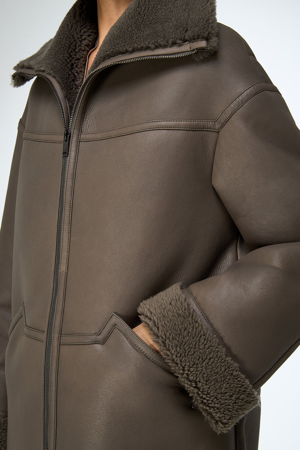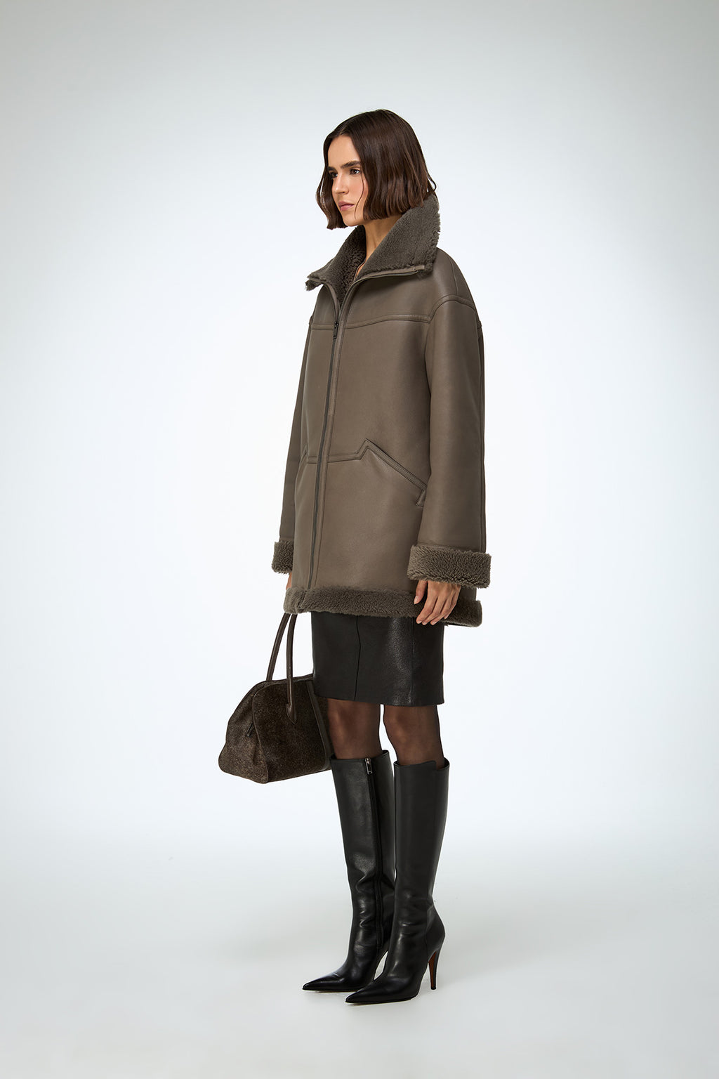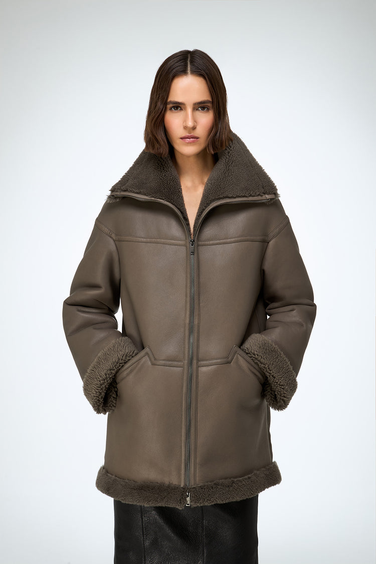 Crafted in soft lamb shearling leather with oversize silhoutte, front pockets, stand up collar, double zipper closure, fur trimmed hem and cuff line.