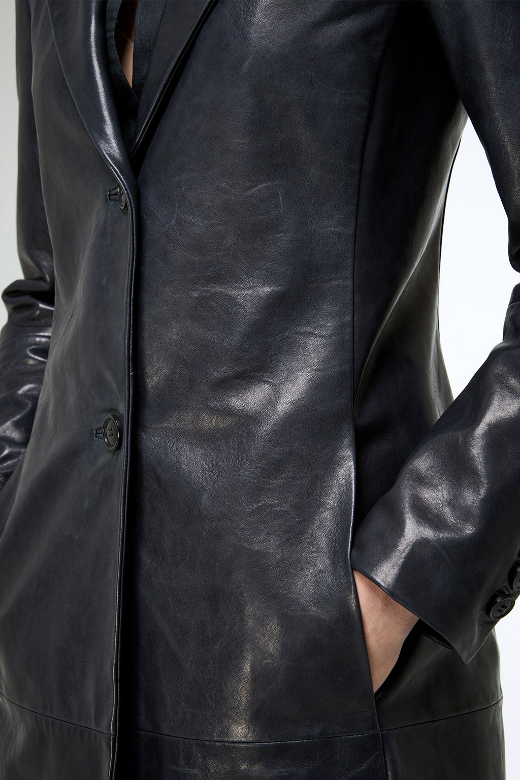 Single-breasted fitted long leather coat with side pockets. Double-button closure adds a powerful look. Crafted in premium 100% lamb leather with a luxurious finish. The open front detail enhances its refined, elegant appearance.