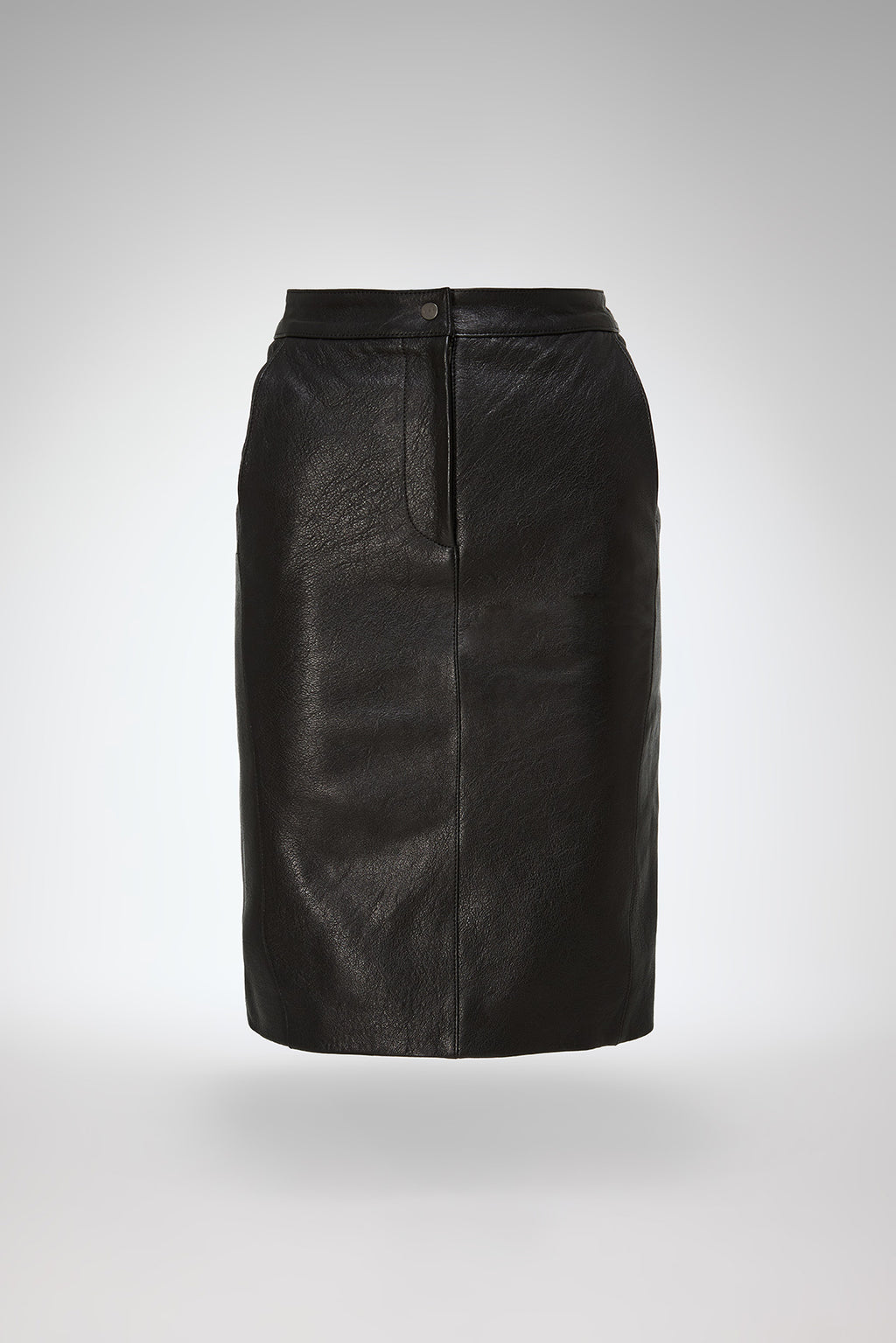 Knee length nappa leather tailored skirt with front zipper, snap button and side pockets. Fitted with back slit.