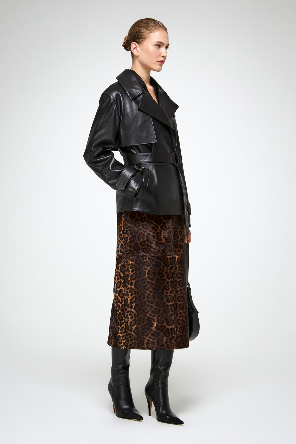 Hip-length leather jacket in a trench-coat style with a classic relaxed fit. Features a belted waist, single storm flap, welt pockets, and long sleeves with cuff strap details