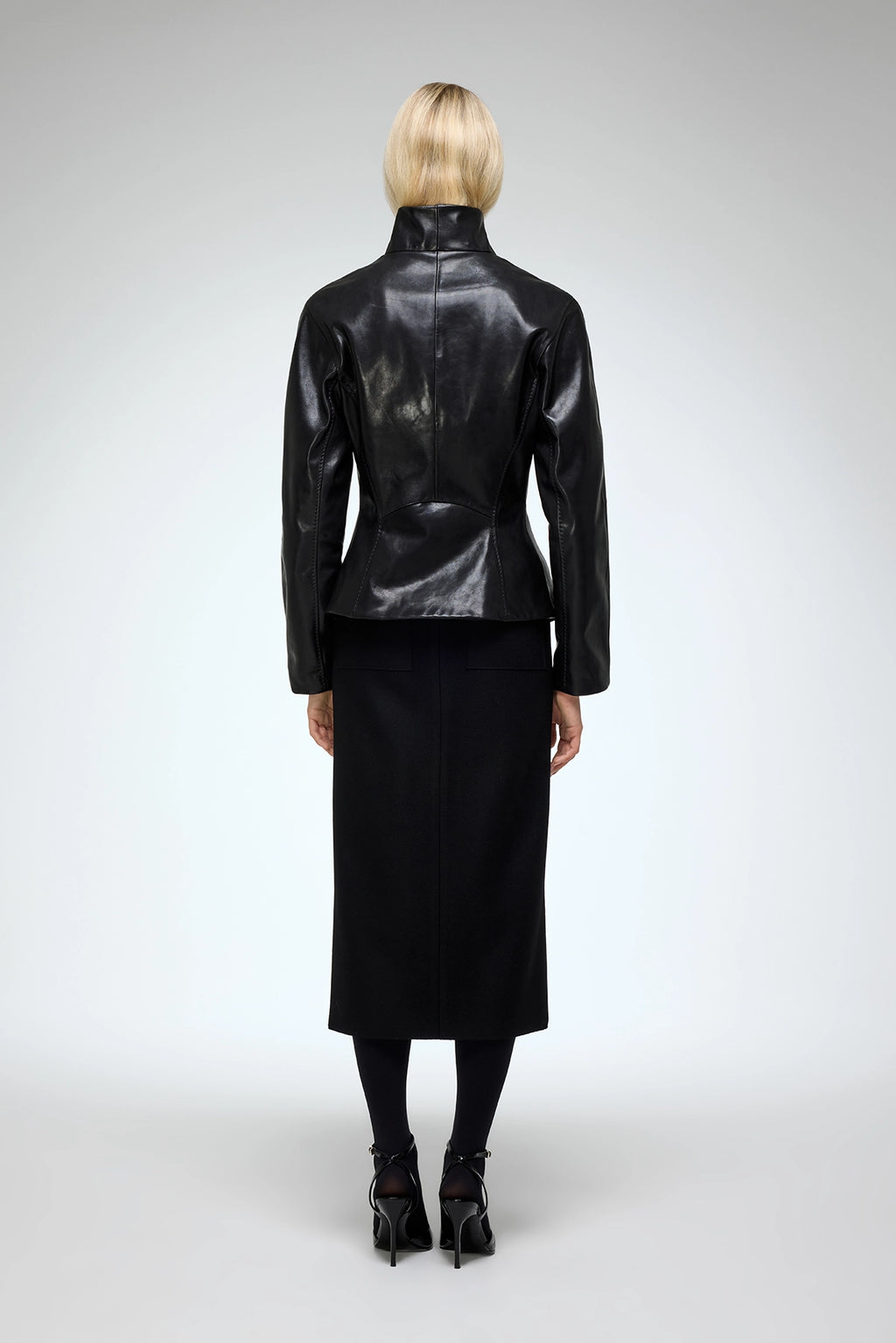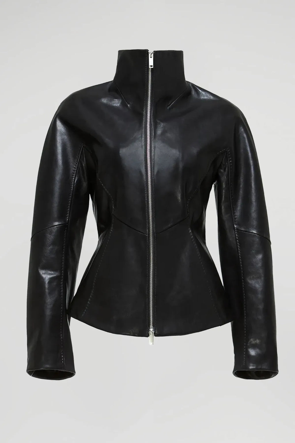 Funnel-neck, hip-length regular-fit leather jacket with side pockets. Double-sided zipper closure, detailed front panels, and top-stitch accents for a refined finish.