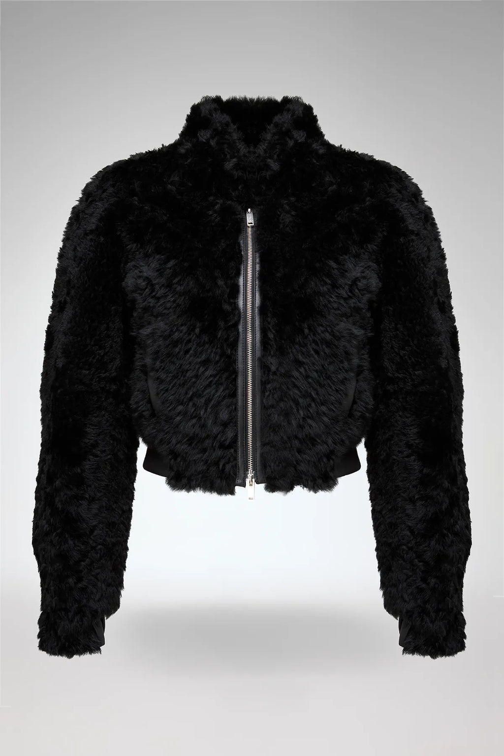 Cropped shearling bomber jacket with double-sided front zipper and leather detailing. Elasticated waist. Side pockets. Regular fit