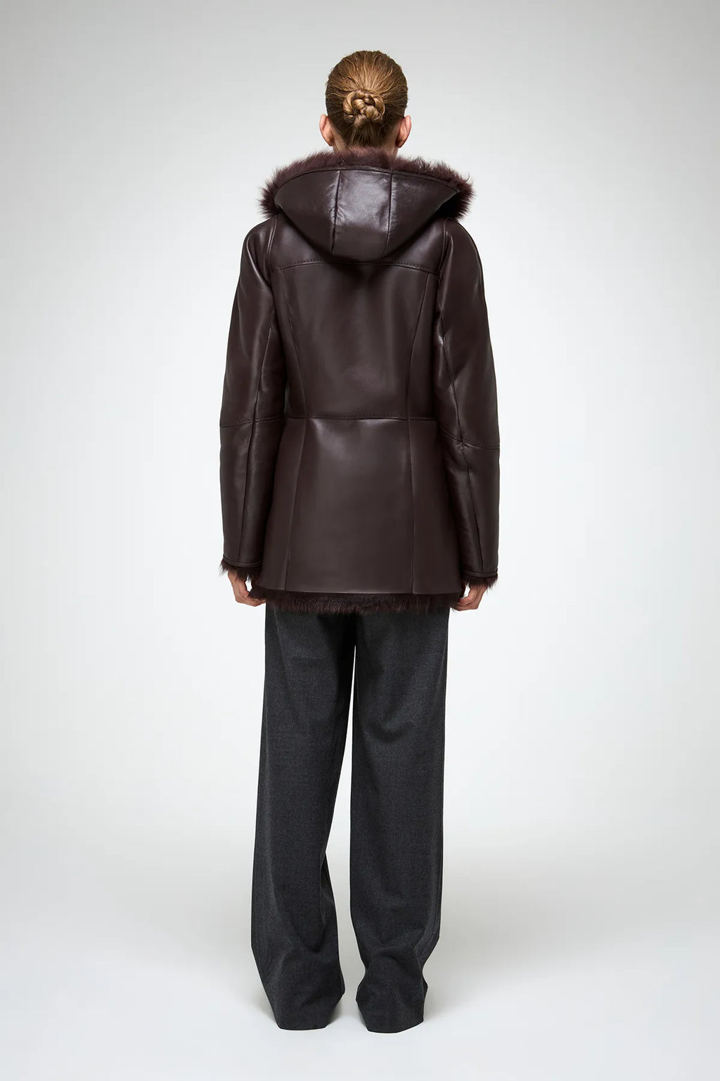 Crafted from 100% lamb leather with a luxurious vintage-soft or lappe-inspired finish. This hip-length shearling coat features a front zip closure and a tailored, contoured fit for a sophisticated silhouette. Includes zippered and slip side pockets for a refined look.