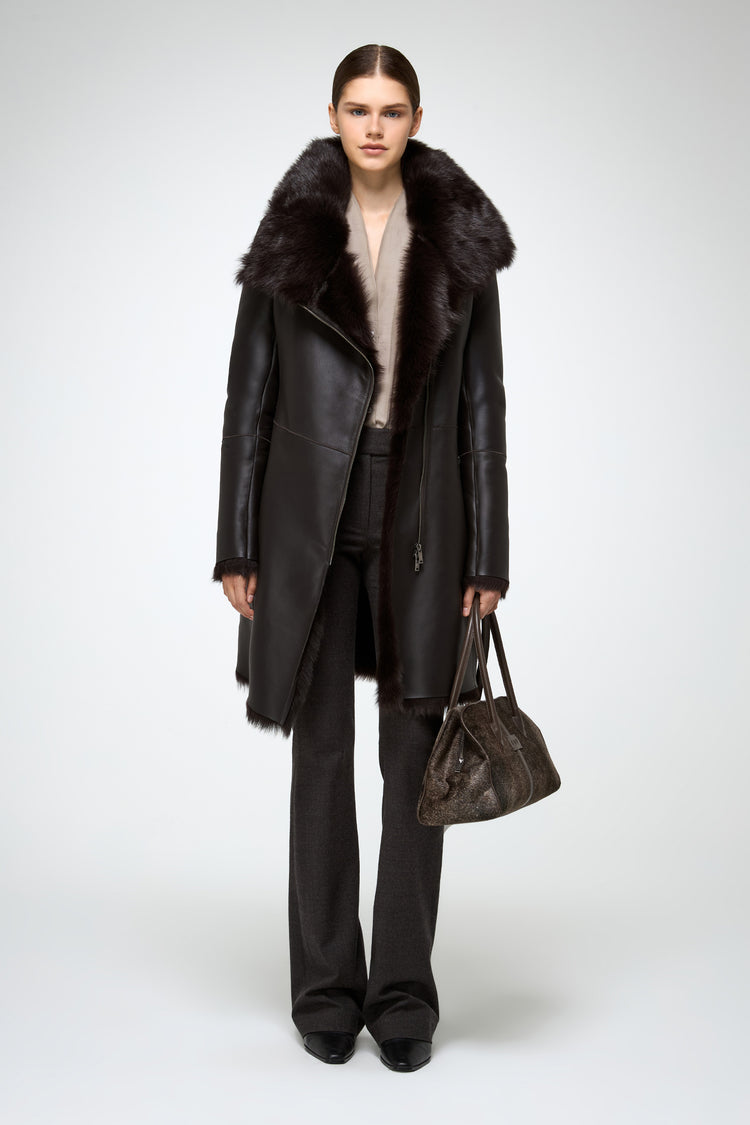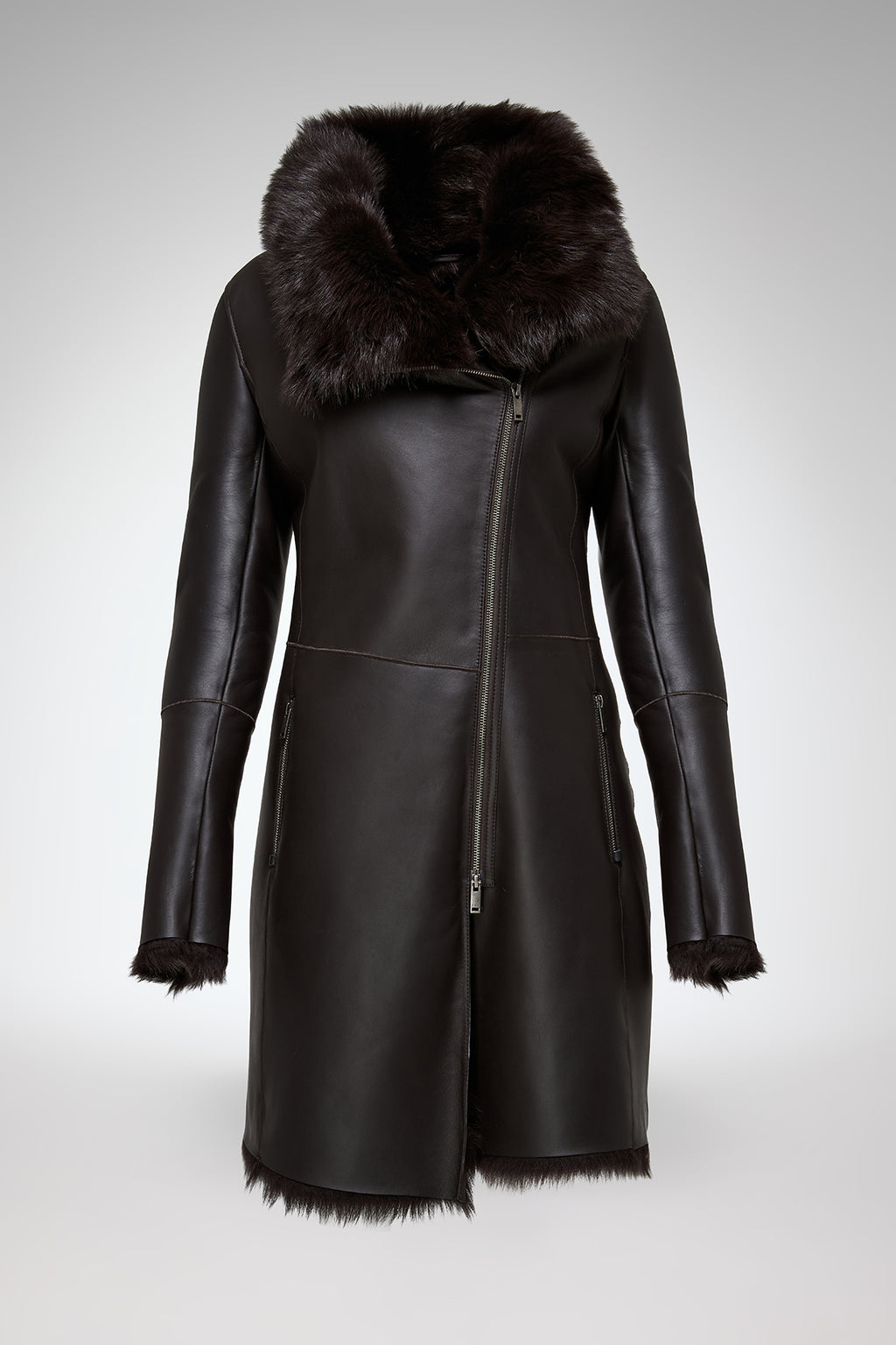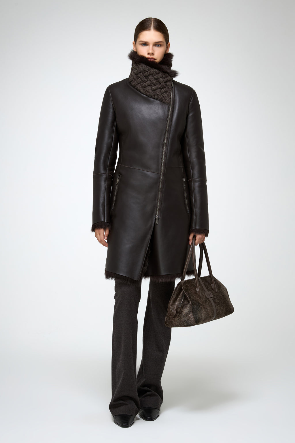 Crafted from 100% lamb leather, this shearling mid-knee length coat features an asymmetrical zip closure and a stand-up collar. Designed with a tailored, structured fit for an elegant and refined silhouette. Includes side pockets and Kit merino woll knitted under-collar details - authentically crafted.