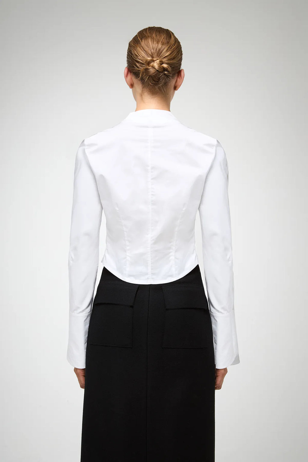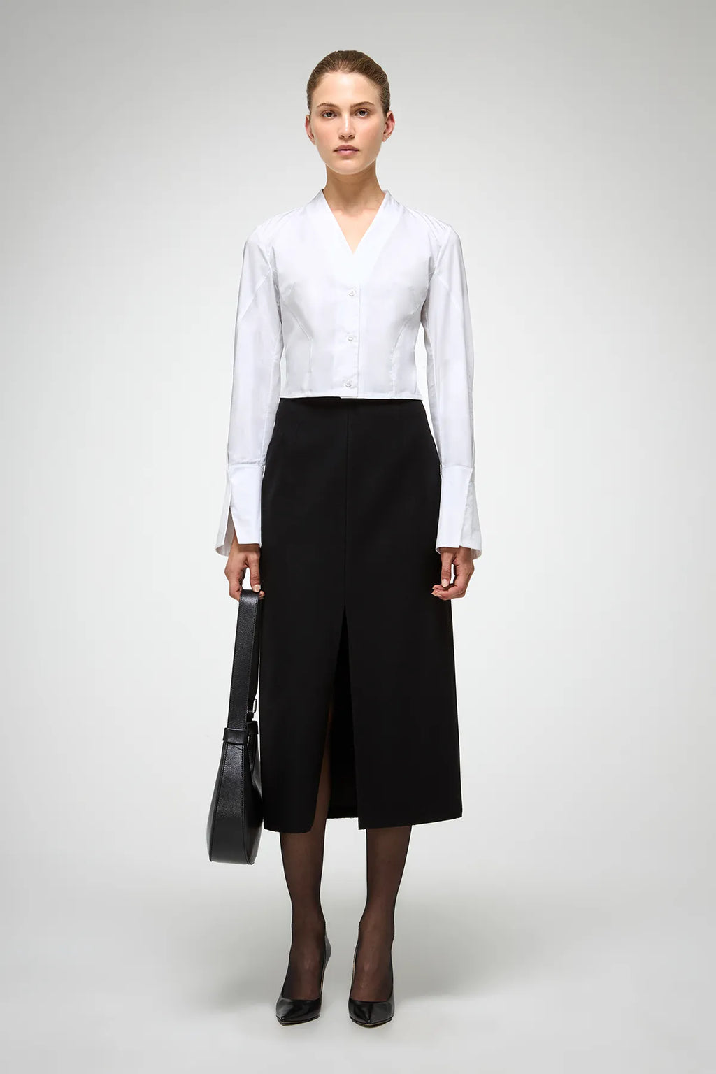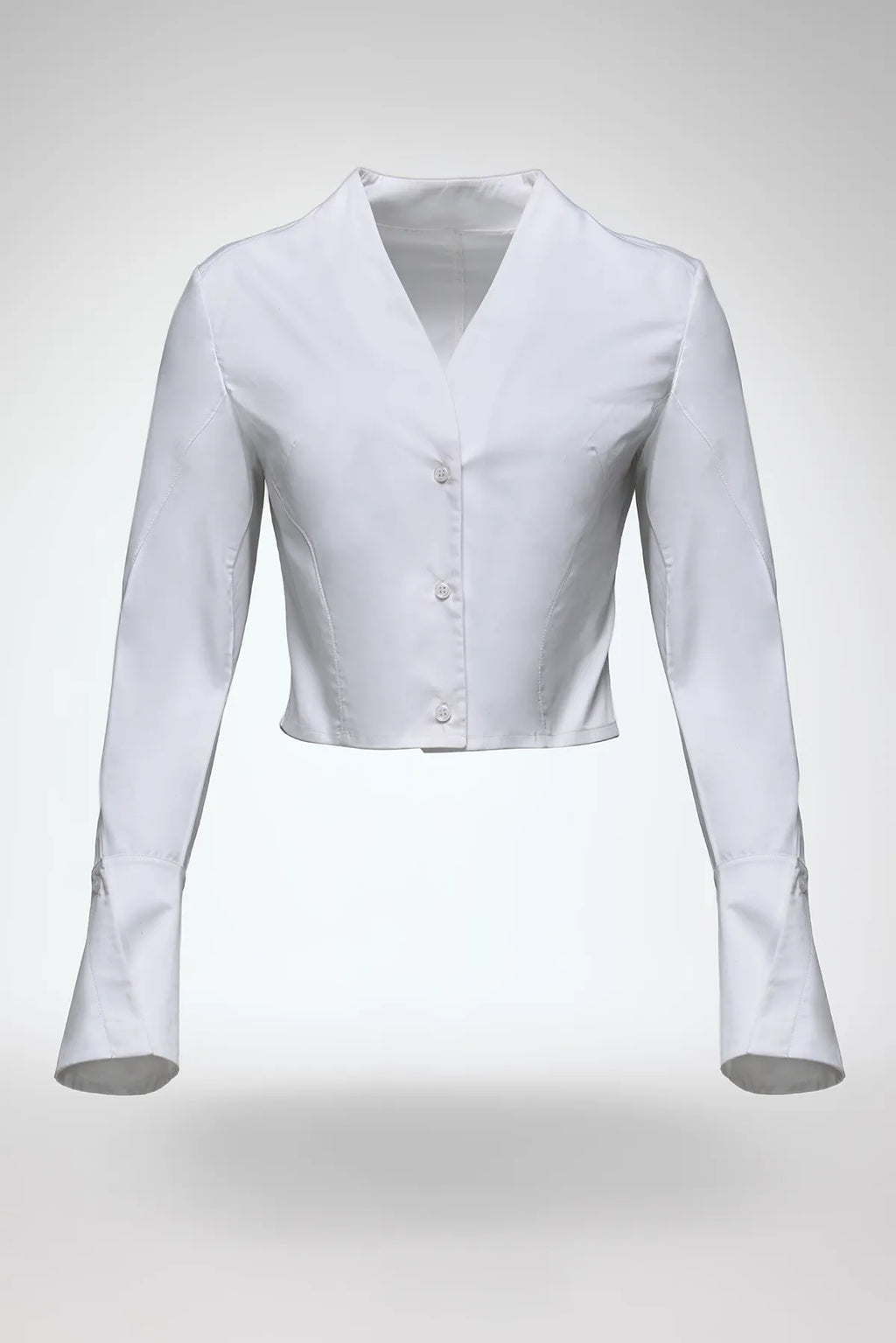 Super-cropped button-down shirt with V-neckline. 100% cotton.