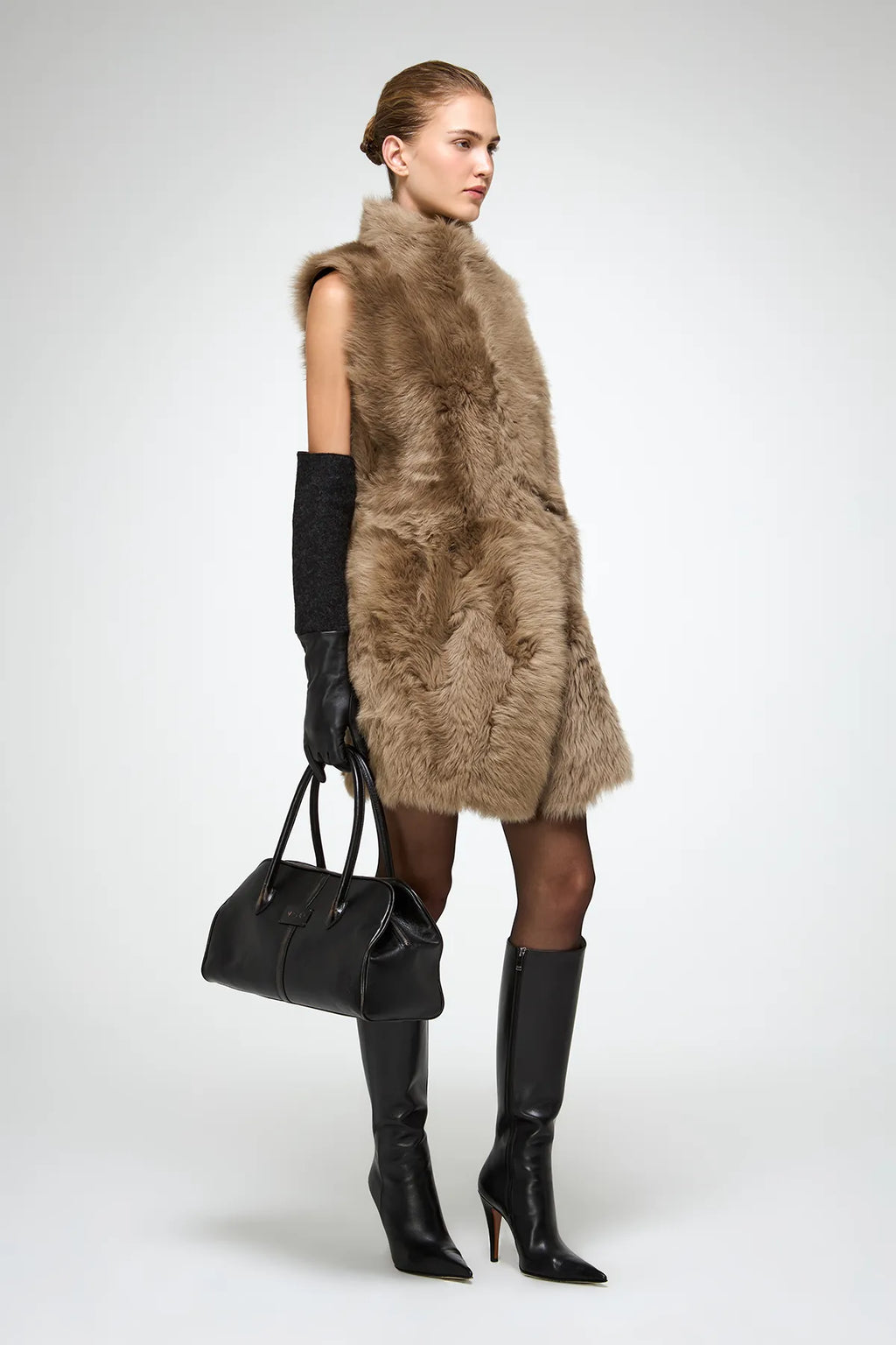 Over-the-knee-length shearling vest with crossover asymmetrical front double fastening closure. Side pockets.