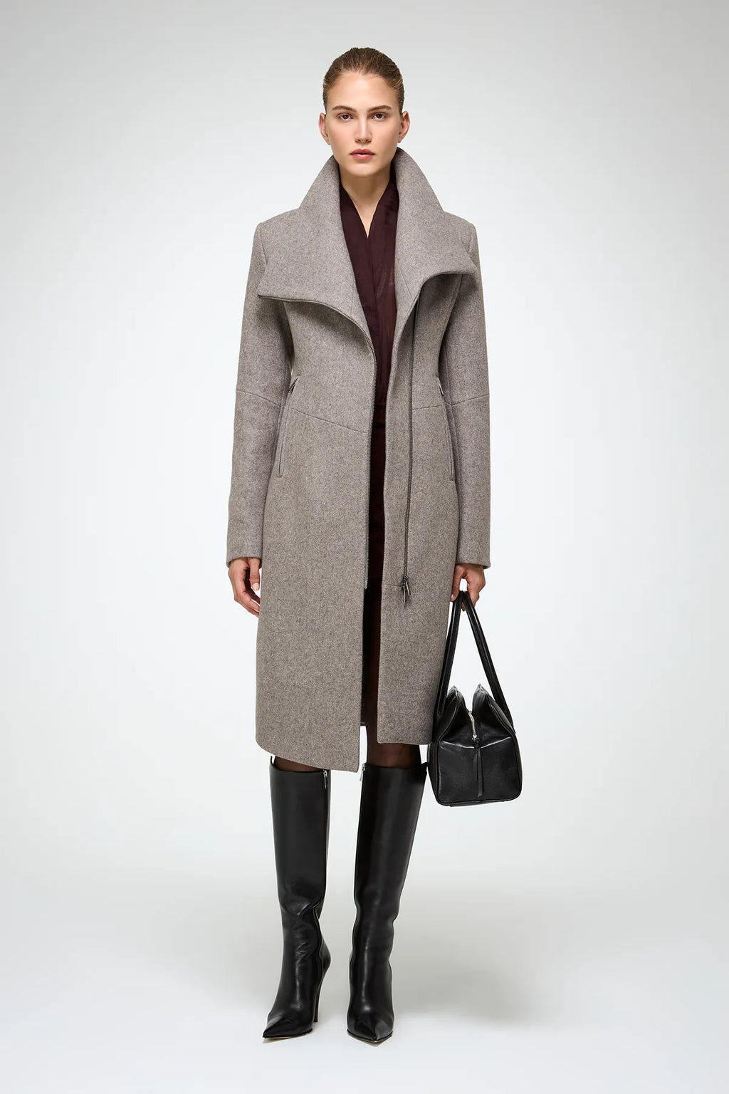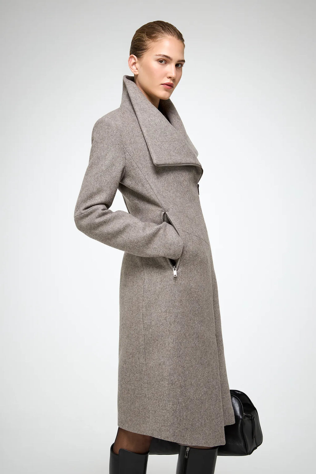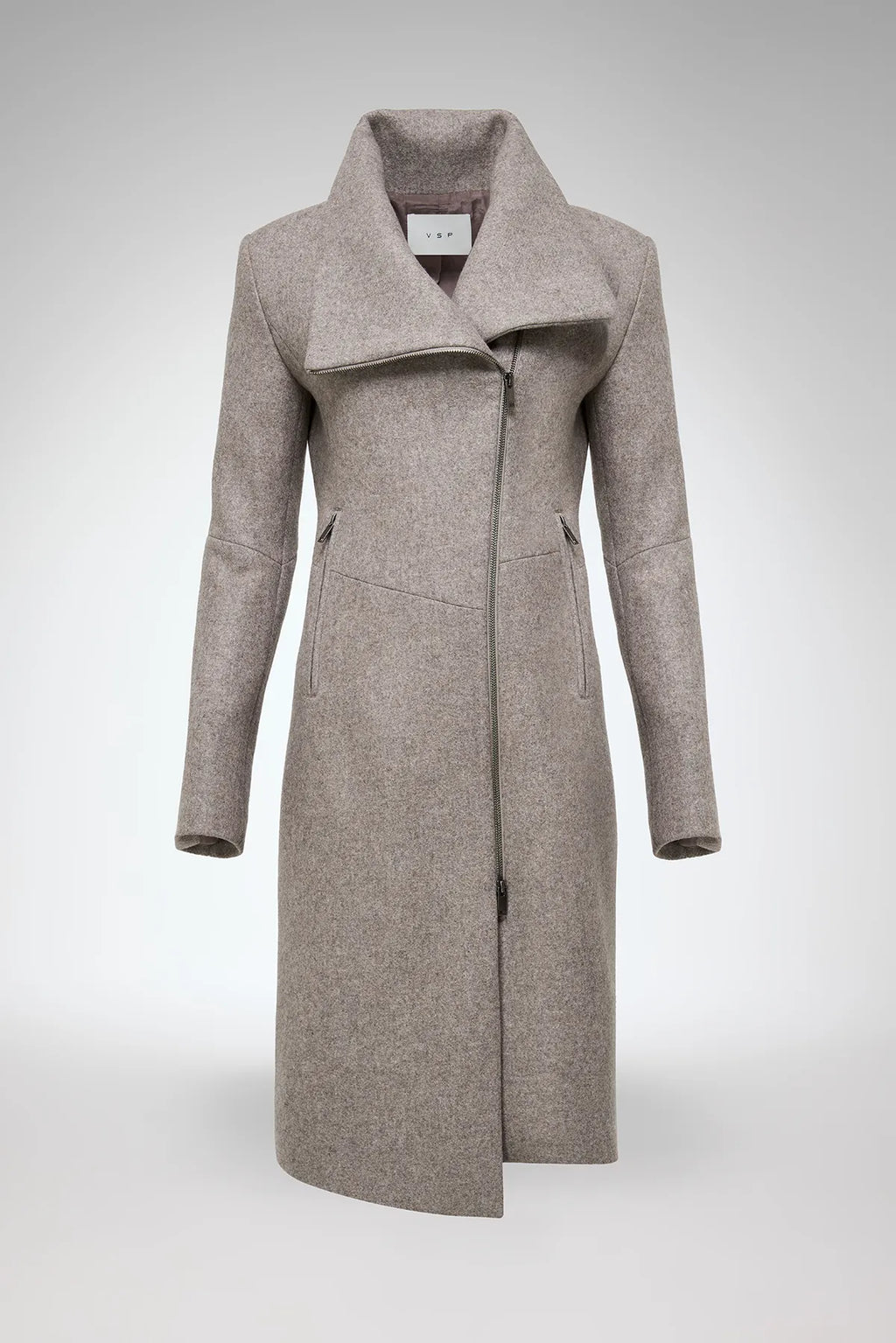 Mid-length wool coat with asymmetrical zip closure and stand-up collar. Structured tailored fit with zippered side pockets.