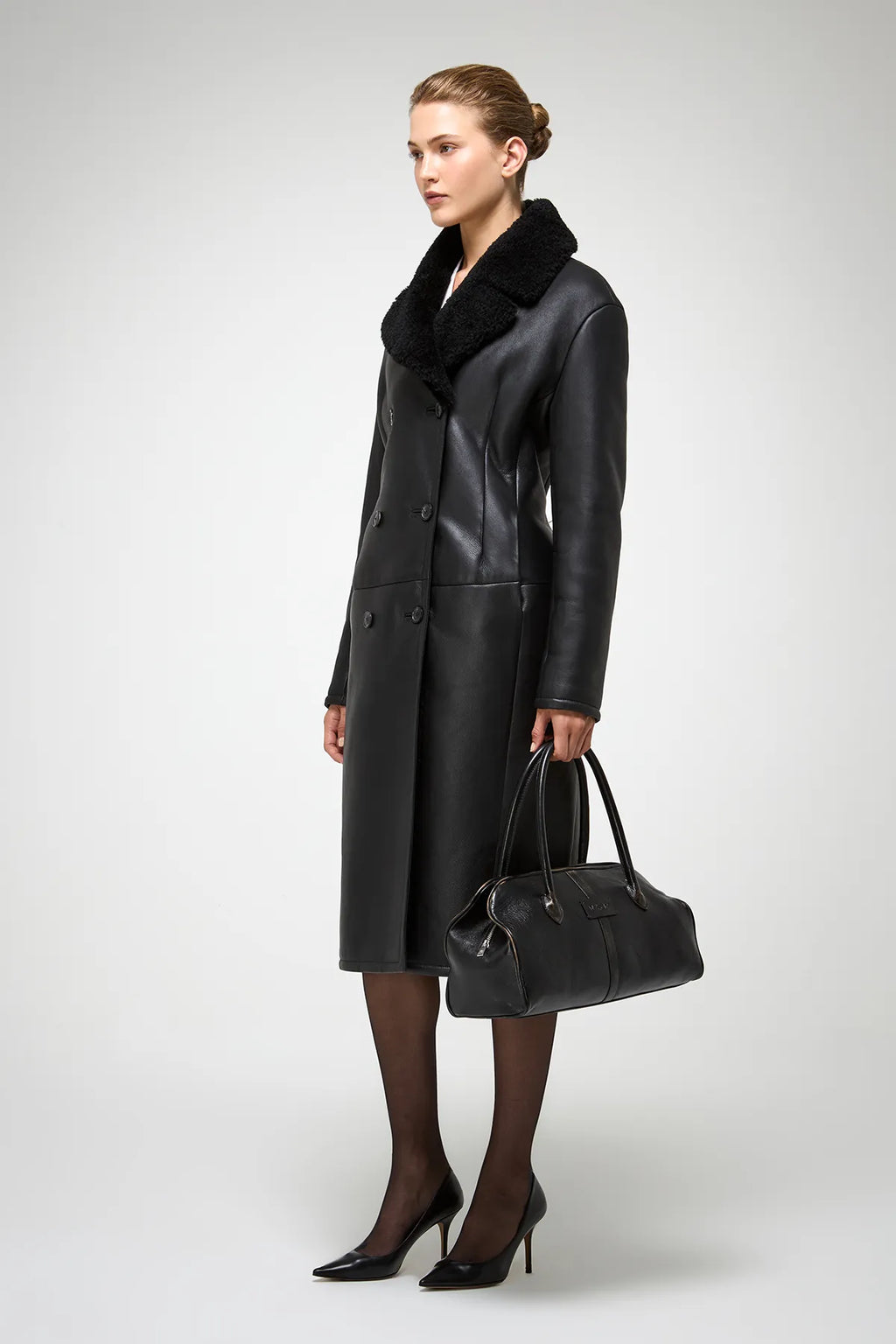Premium lamb merino shearling coat with a double-breasted front and a wide notch collar. Knee-length tailored design with a structured fit and side pockets for a sophisticated, feminine look.