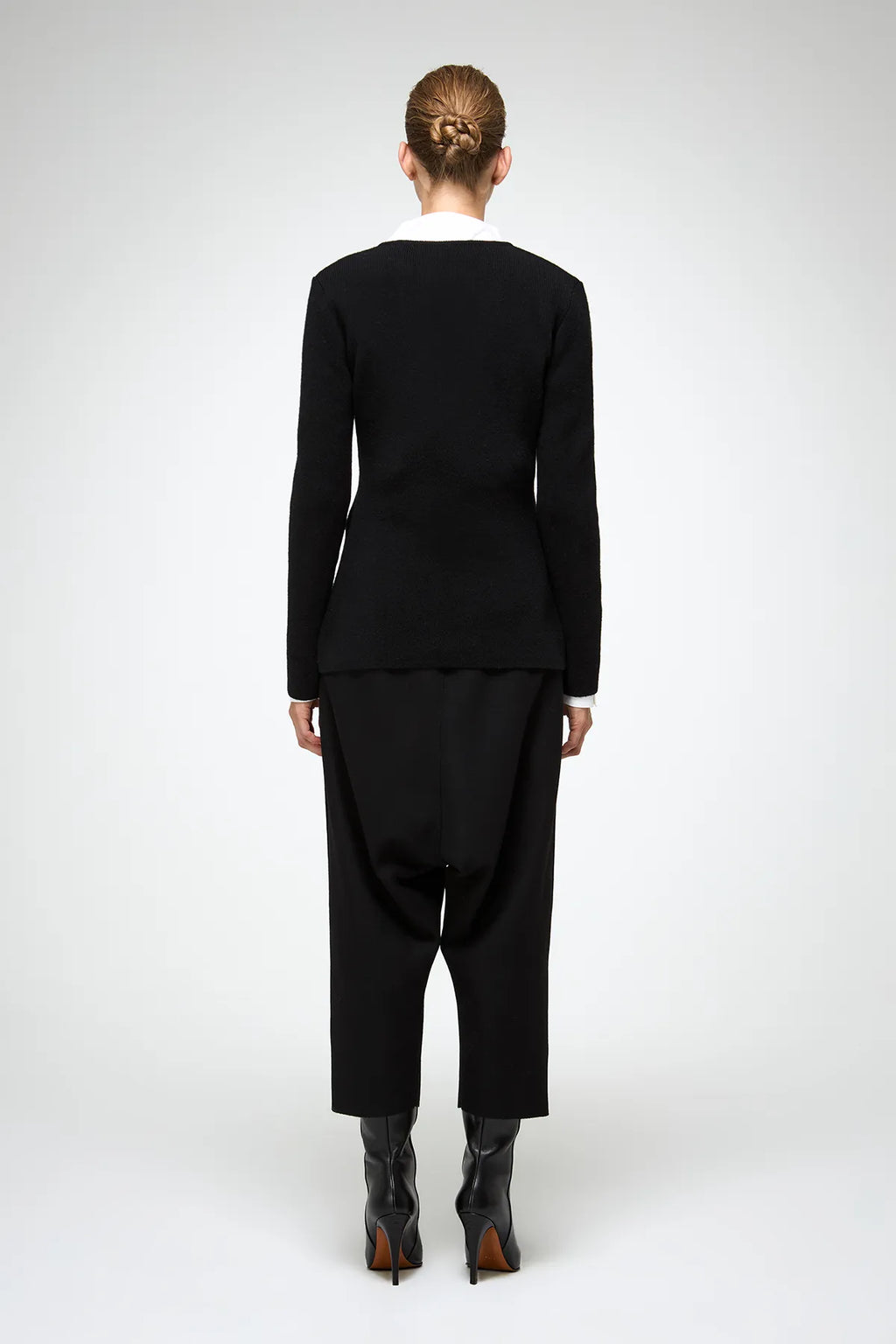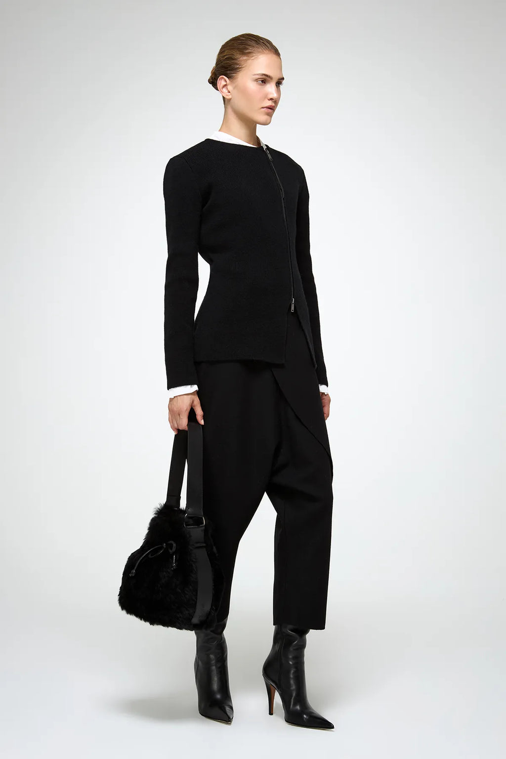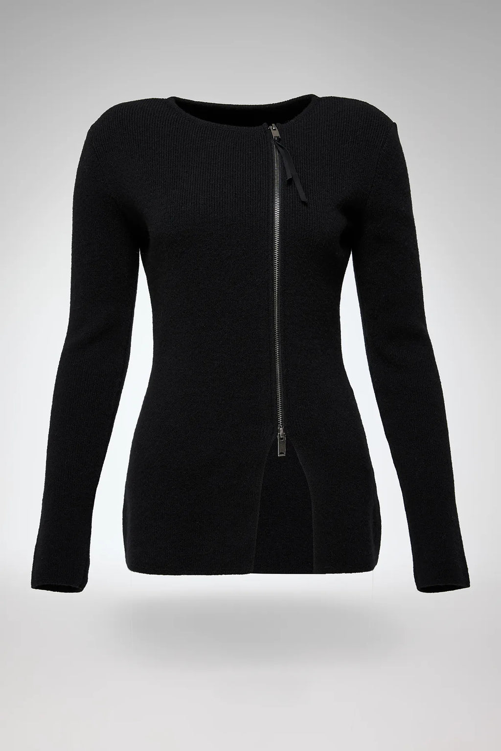 Fitted merino wool-mix ribbed knitted cardigan. Double-sided zipper opening. V-shaped hemline