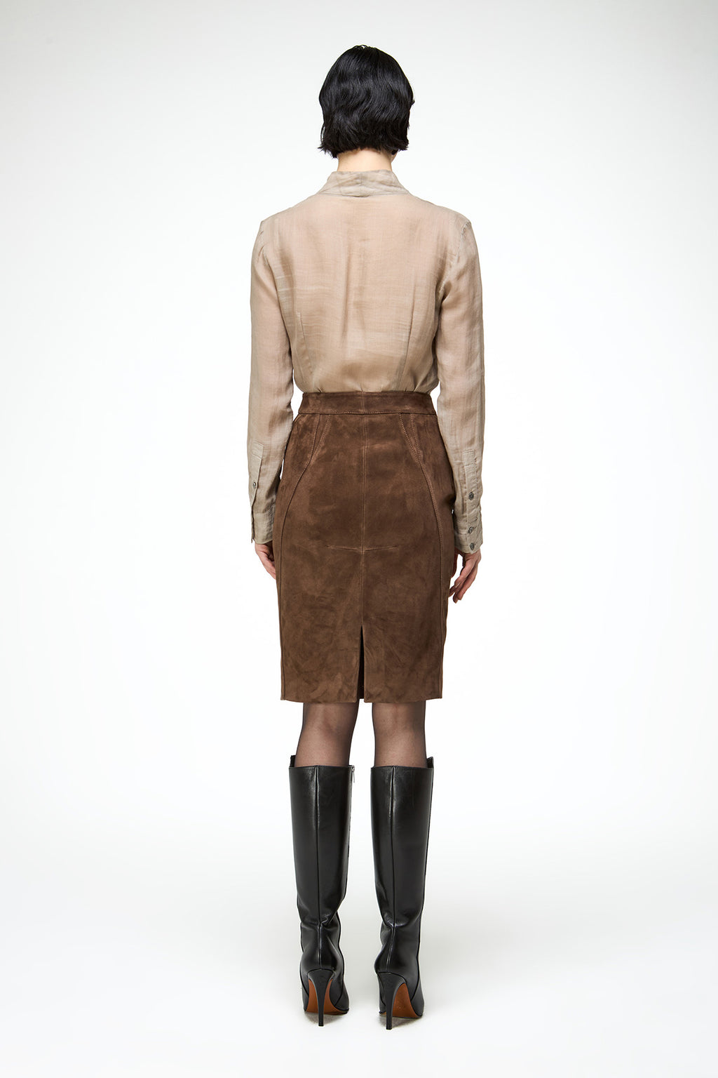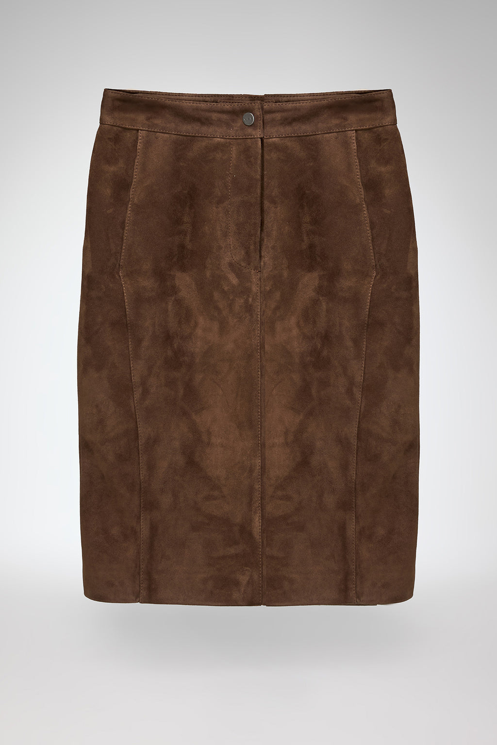 Confectionnée en daim de chèvre haut de gamme. Jupe mi-longue dotée d'une fermeture éclair à l'avant, d'un bouton-pression et de poches latérales. Coupe ajustée avec fente à l'arrière.
