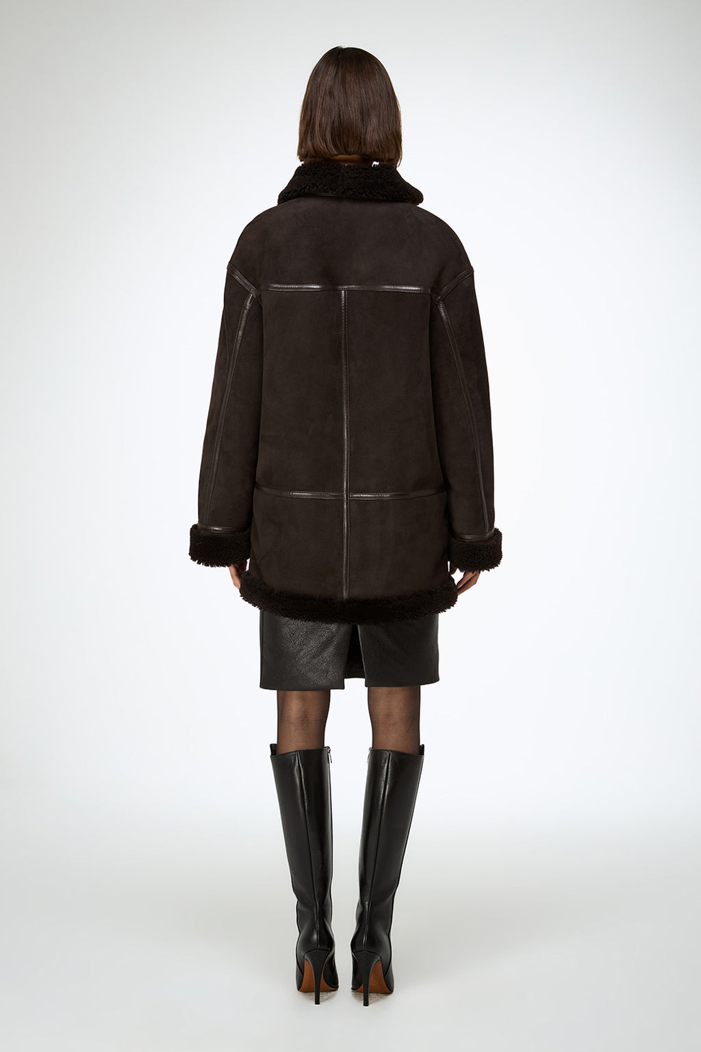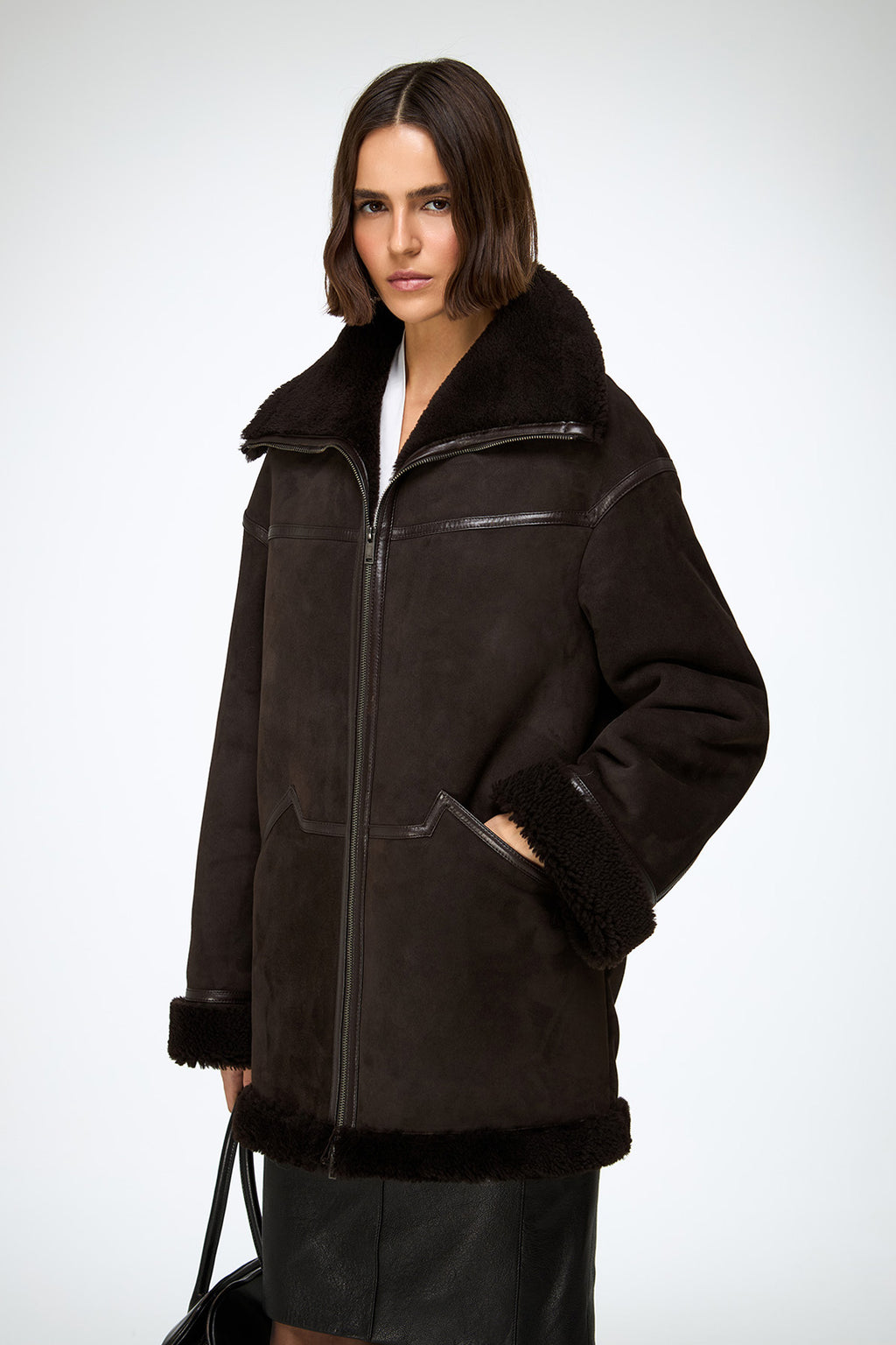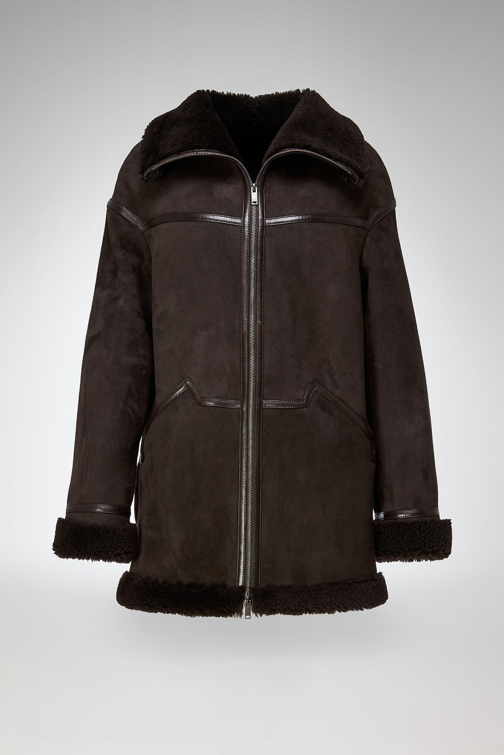 Crafted in soft lamb shearling leather with oversize silhouette, front pockets, stand up collar, double zipper closure, fur trimmed hem and cuff line.