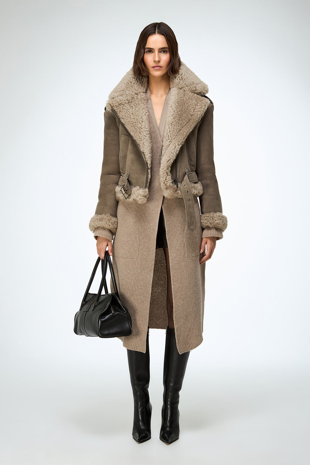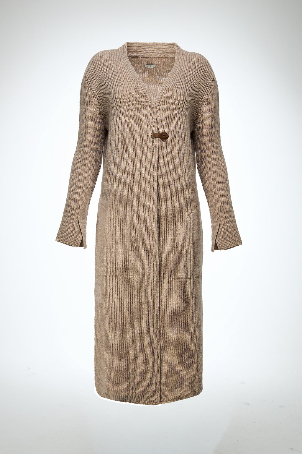 Merino wool mixed rib knit. Long cardigan, Relaxed fit. Side pockets. Side slits on the hem and cuffs. Leather belt accessory closure on the front, Deep V neck.