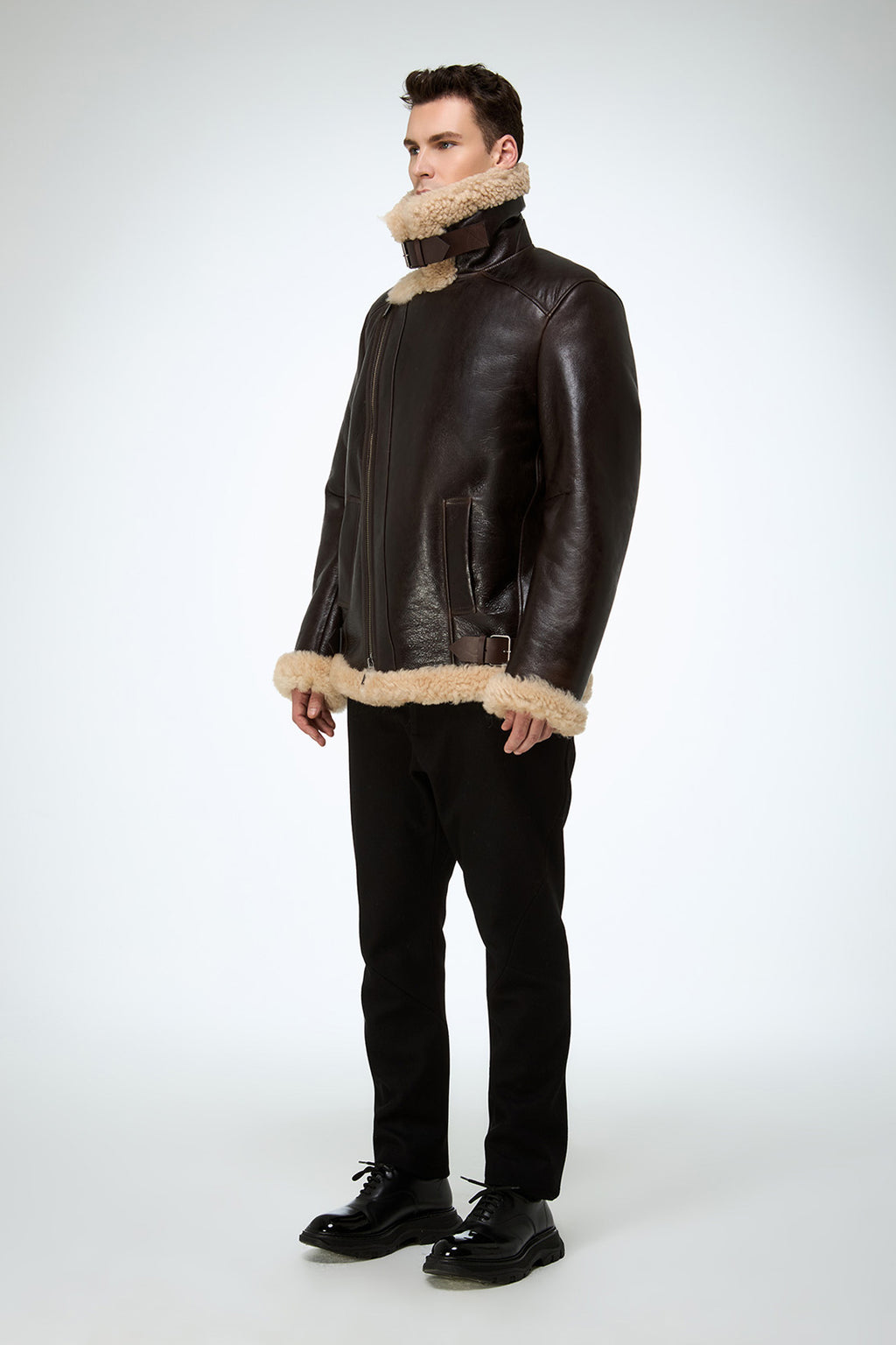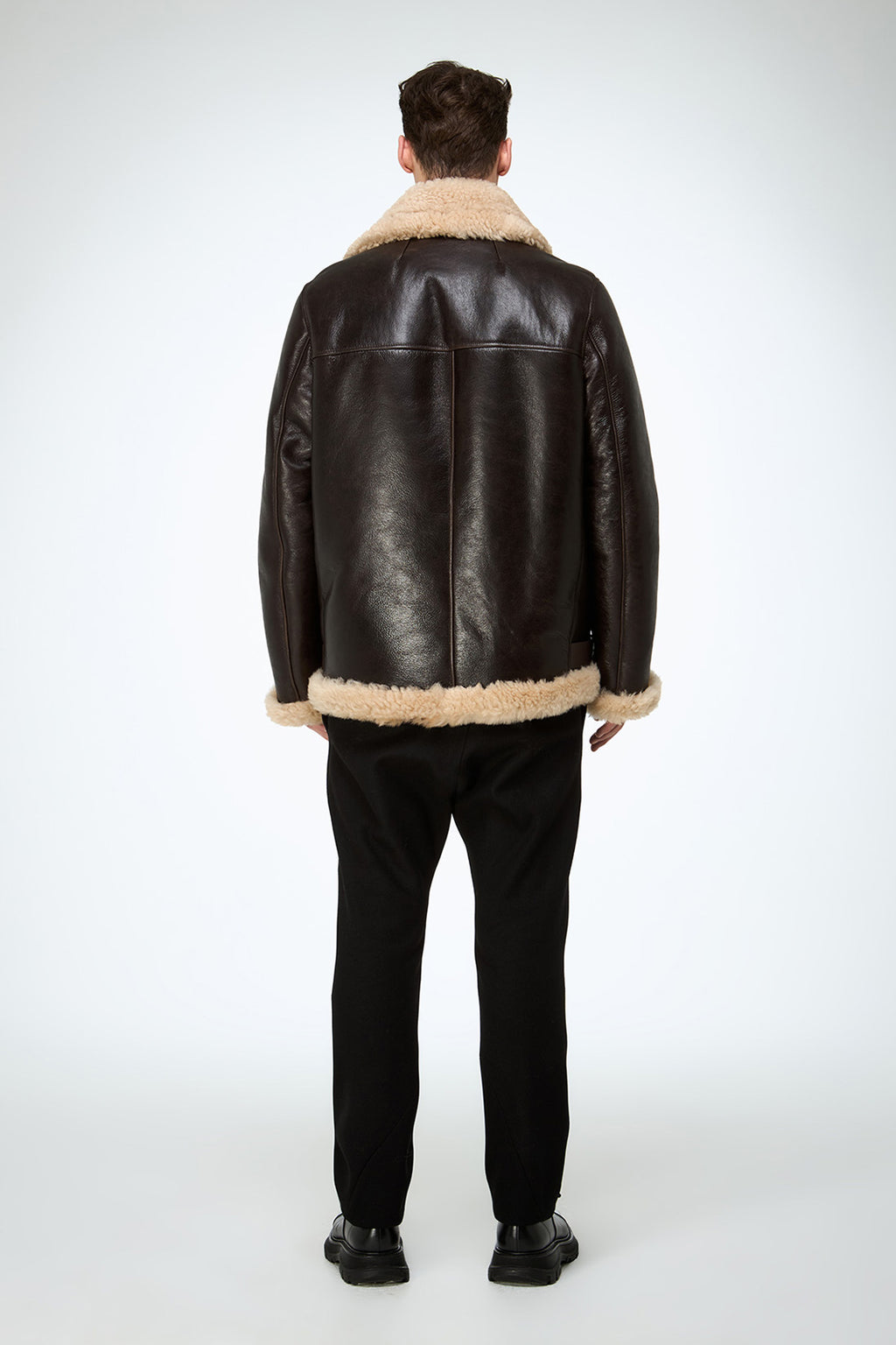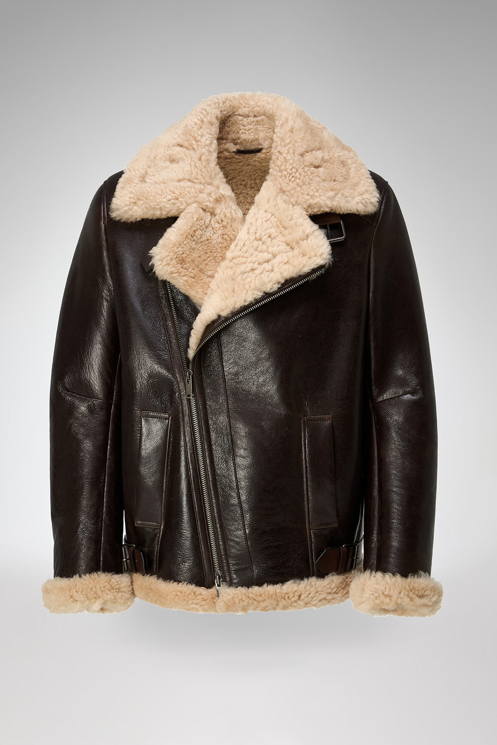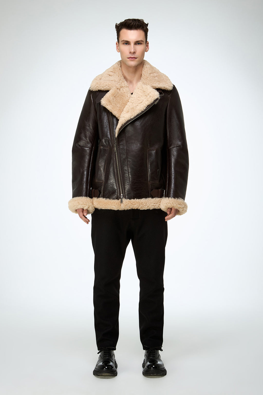 Vintage finish shearling biker style jacket with asymmetrical zippered closure, zippered pockets. Boxy fit.