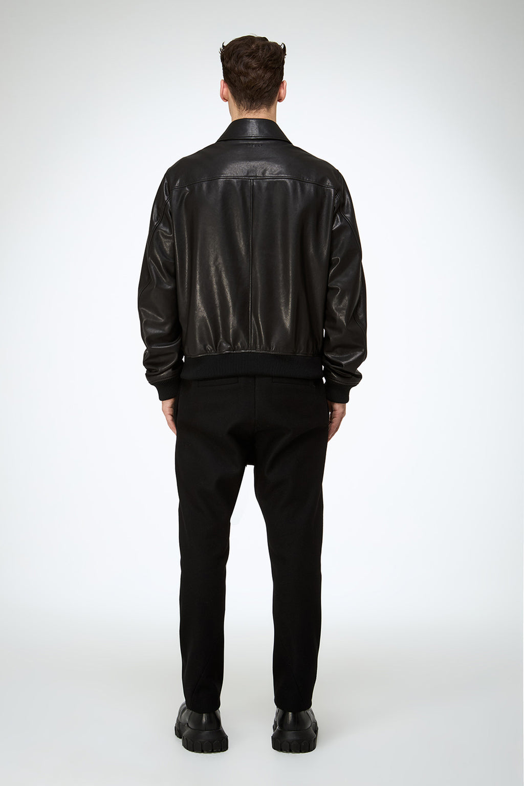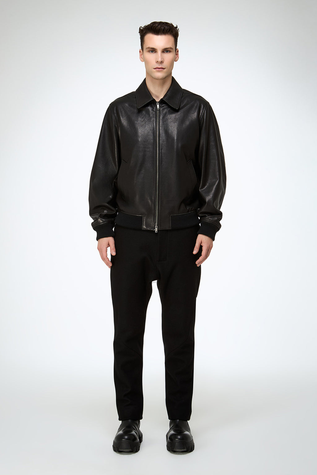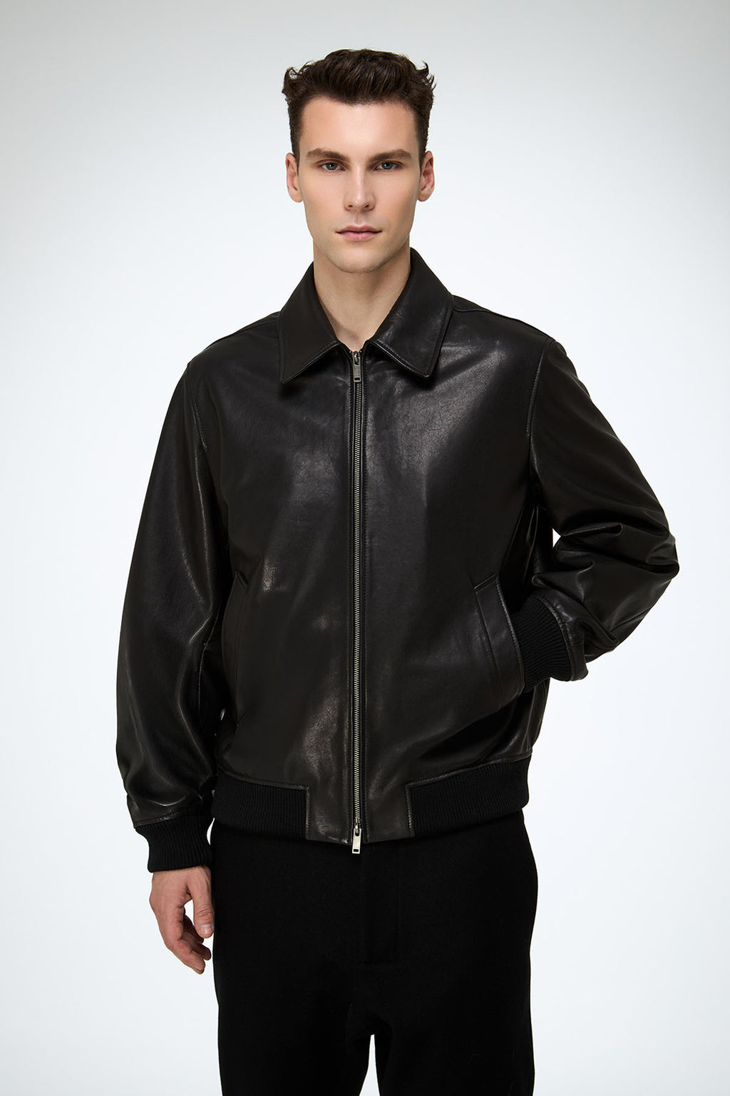 Regular fit, elastic tricot hem and cuffs, shirt style collar. Crafted in vintage finish lamb leather, double sided zipper closure, side pockets.