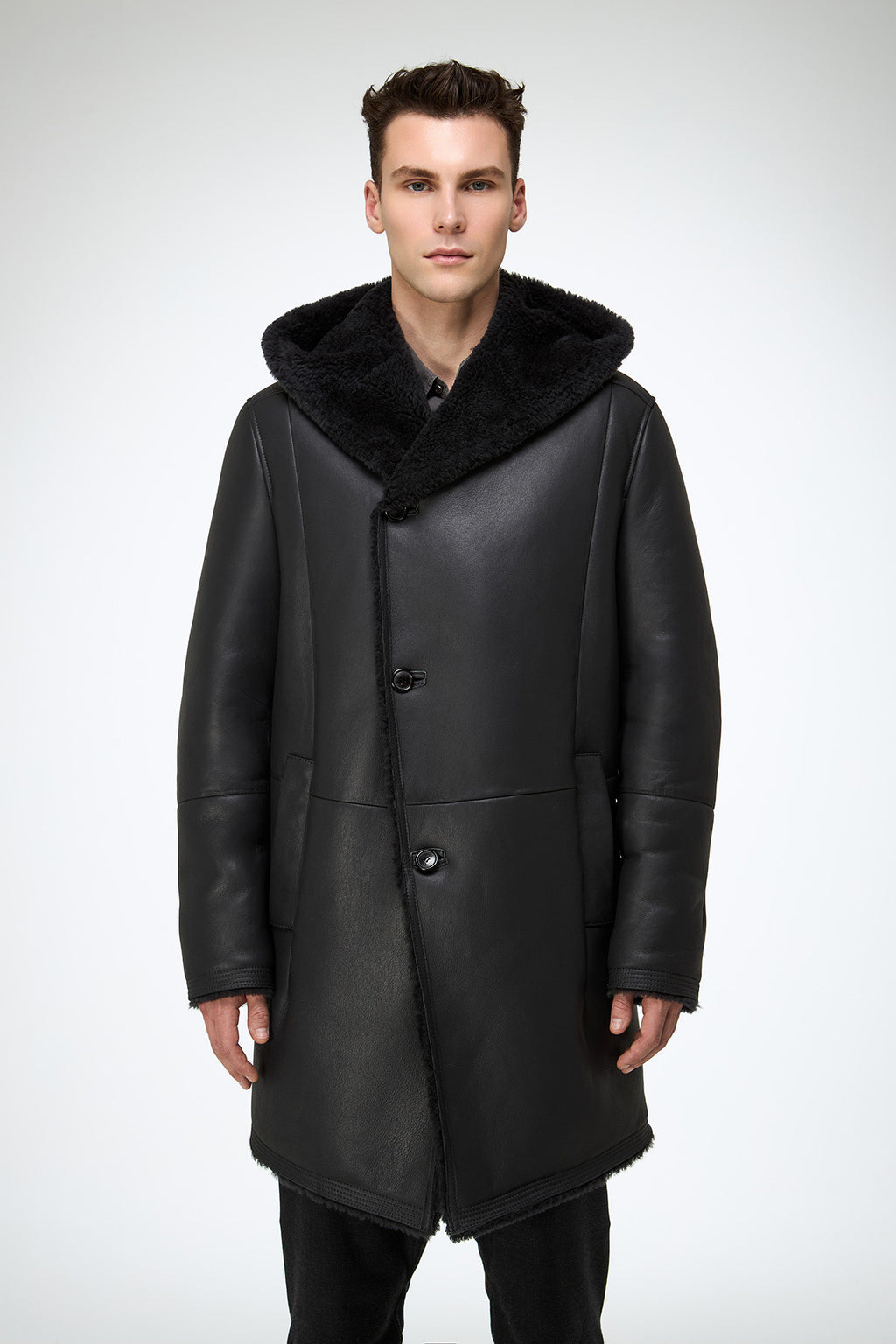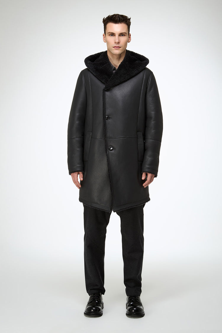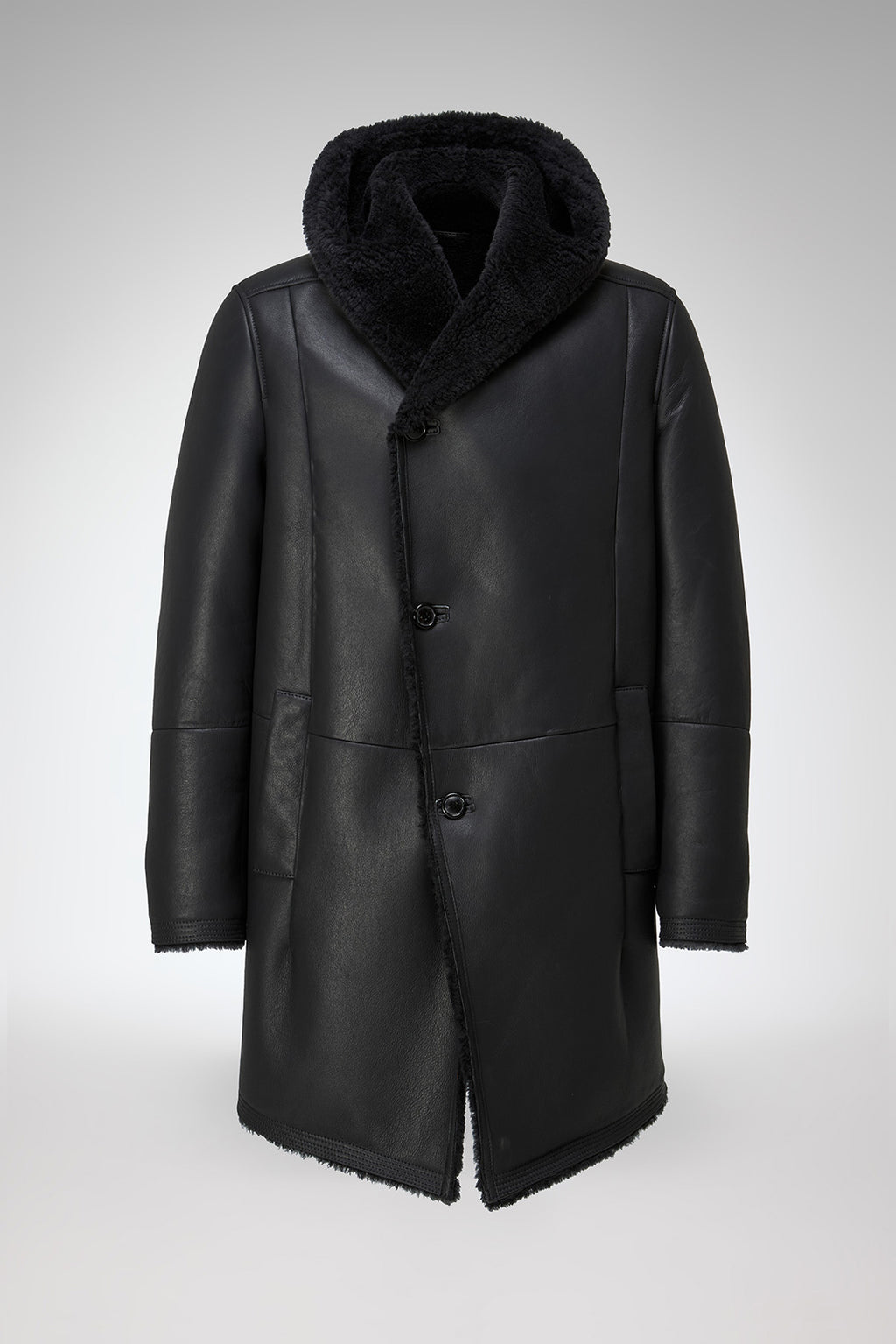 Over the knee shearling coat with shawl collar, two button fastening, slightly angled front, side pockets.