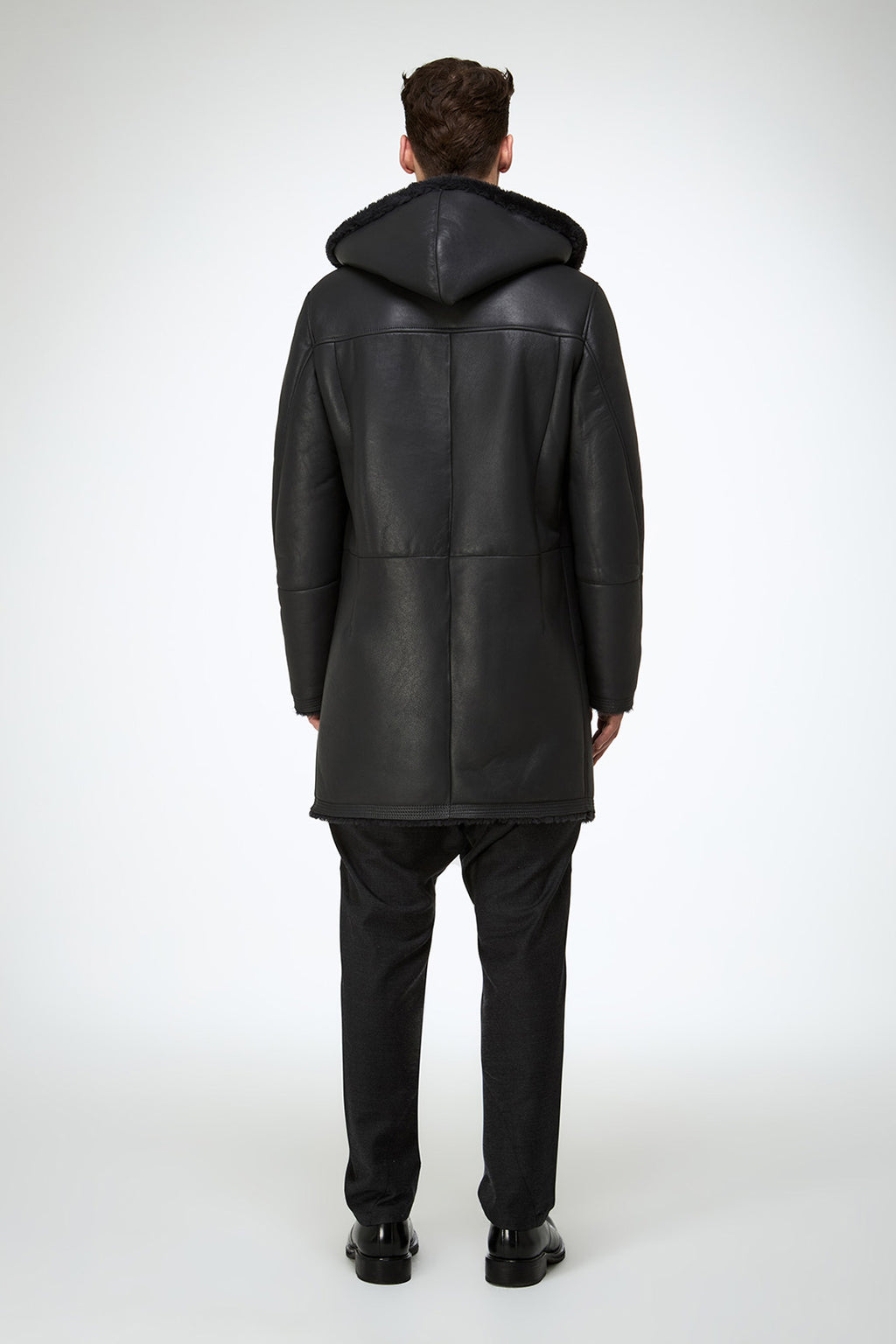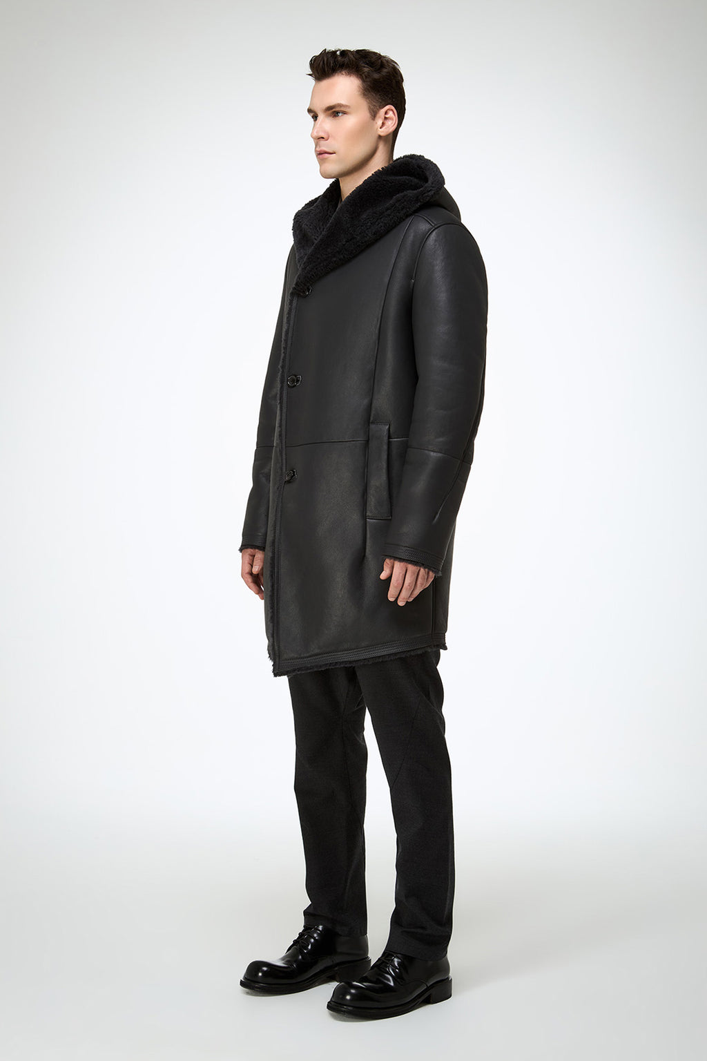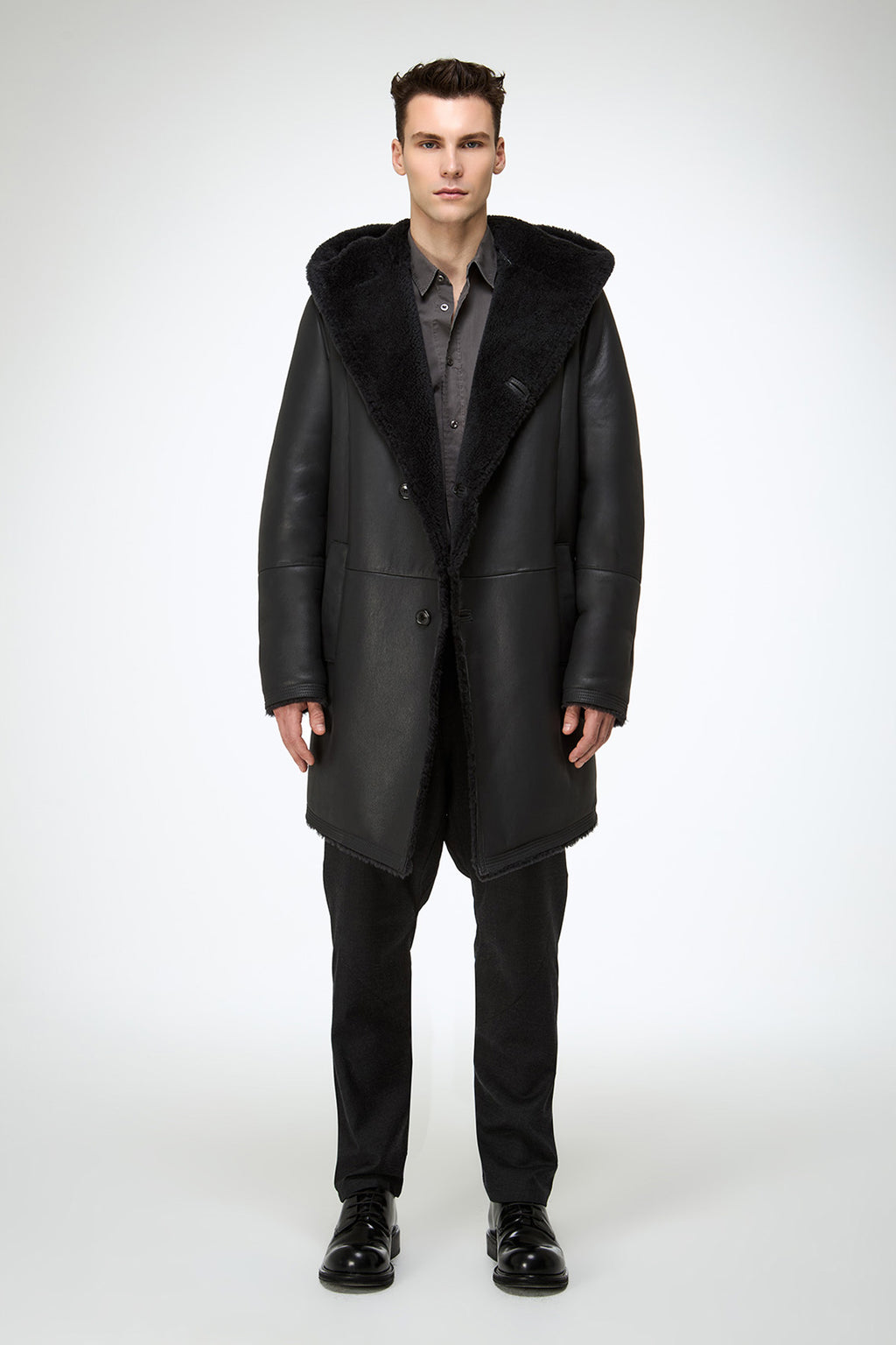 Over the knee shearling coat with shawl collar, two button fastening, slightly angled front, side pockets.