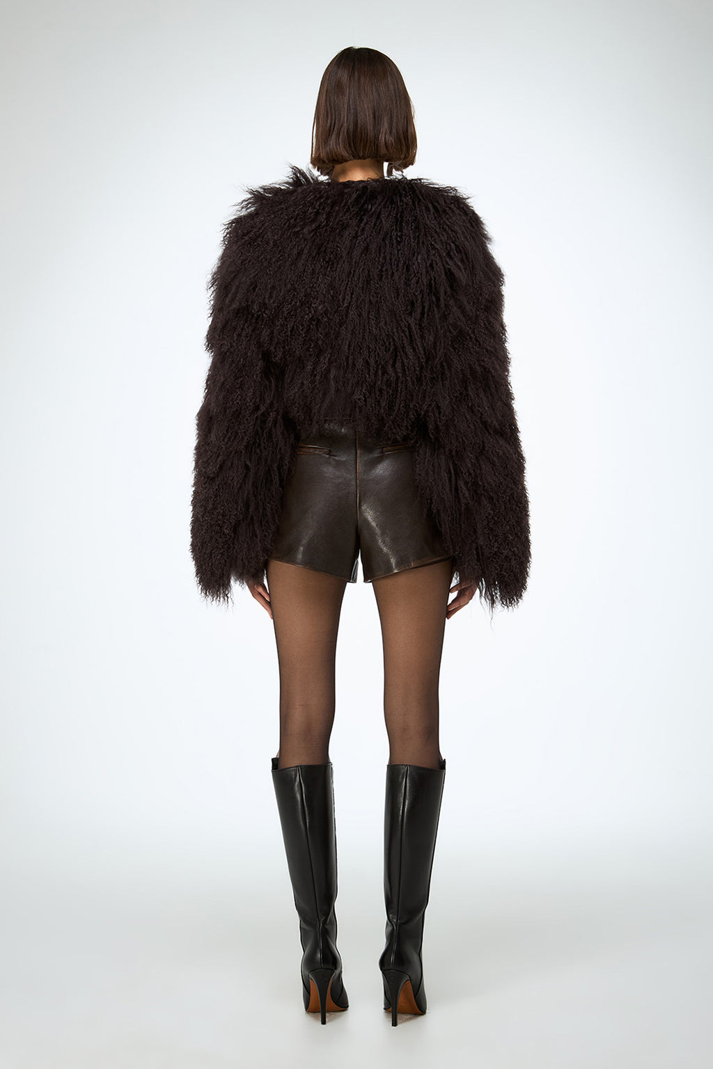 Crafted from plush Mongolian sheepskin, super cropped length jacket with hook fastening closure. Regular fit.