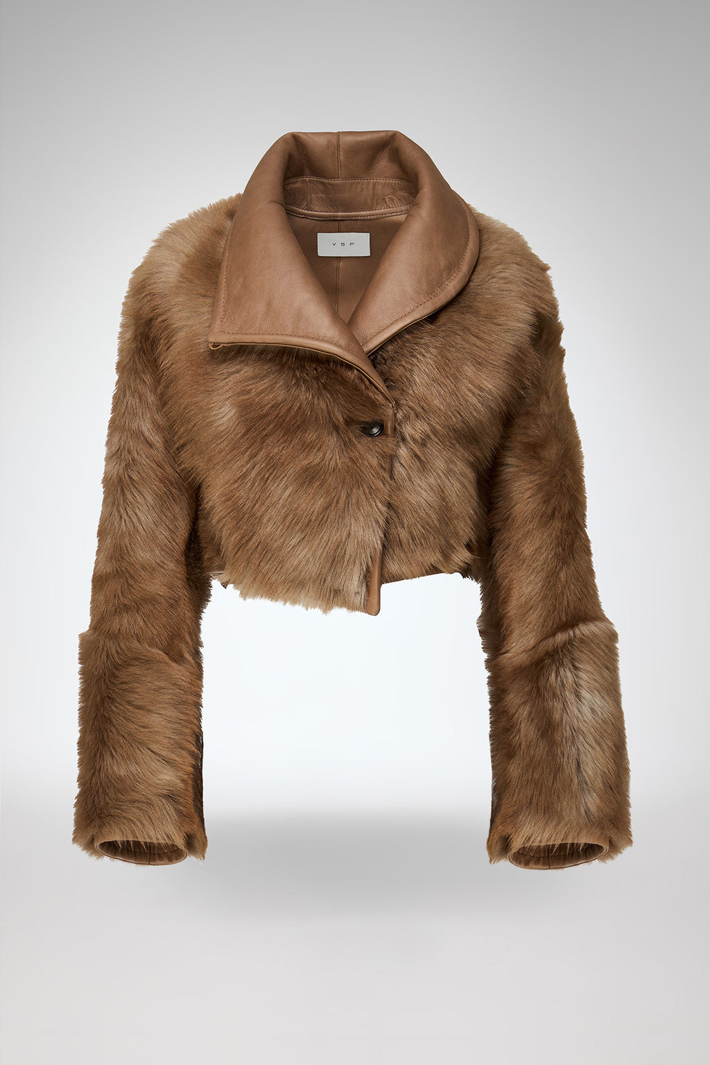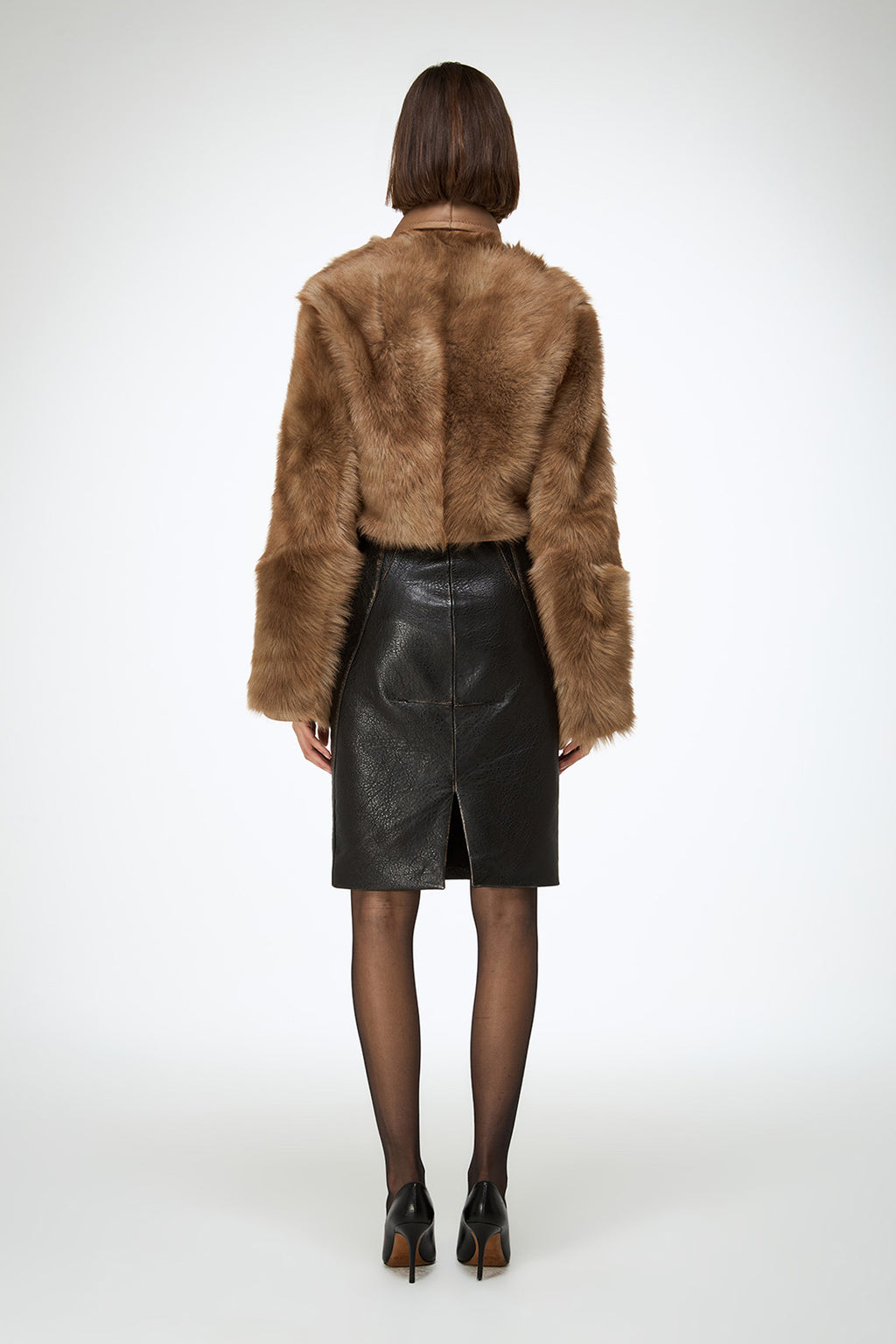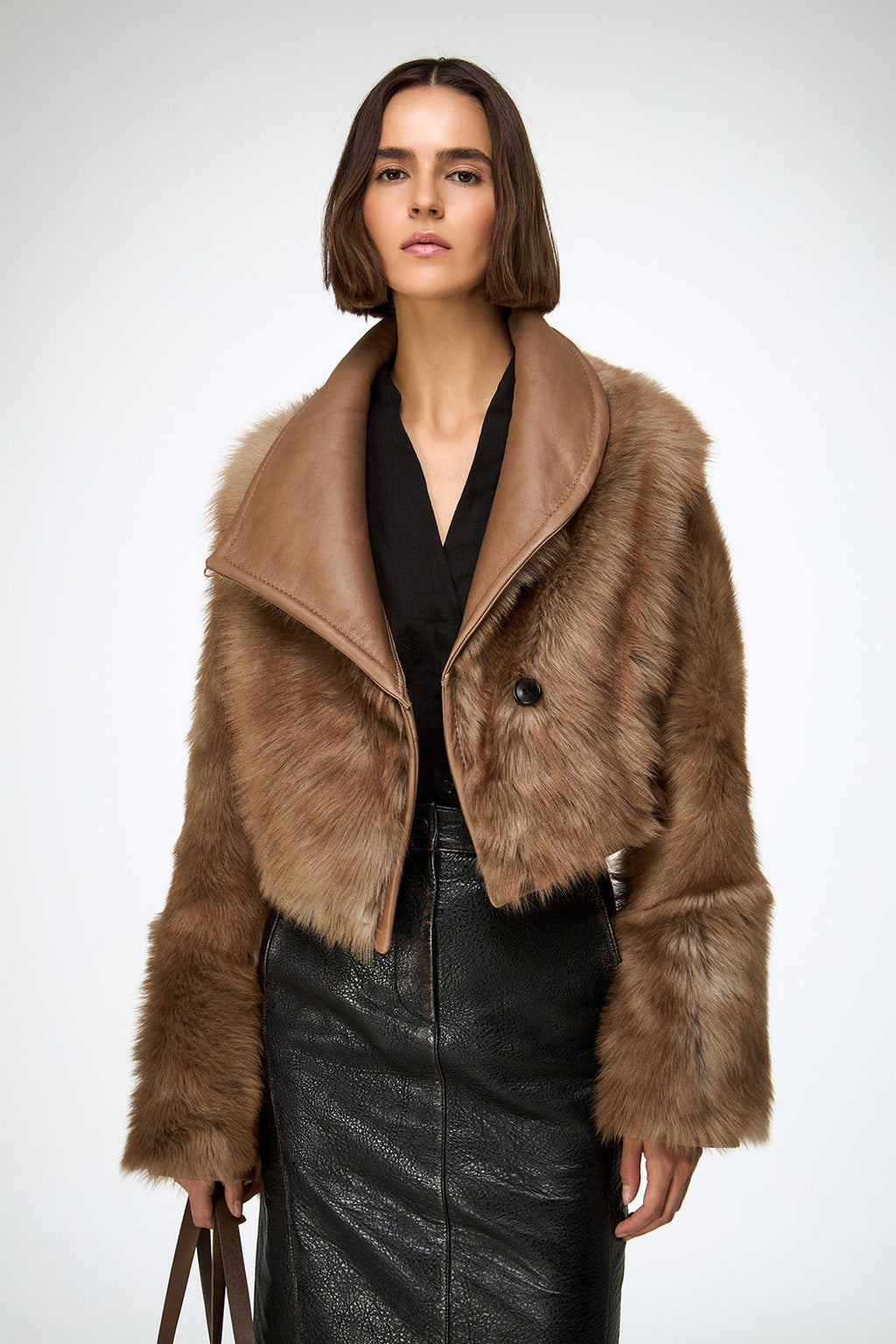 Crafted from plush shearling. Cropped jacket with side pockets, button closure, asymmetrical front leather turn down collar. Fitted silhouette.