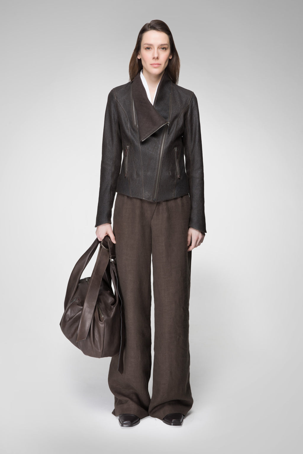 • Veste cintrée en cuir véritable, dotée d'un large col avec fermeture éclair. Combinaison de cuir et de lin. Manches longues. Poches zippées sur le devant.