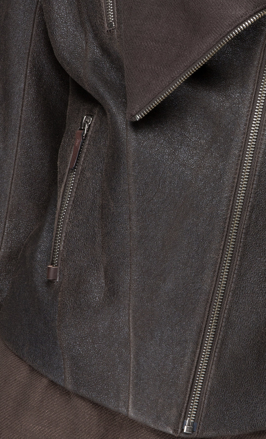• Composition : 100% cuir de chèvre véritable. Bordure du col : 100% lin.