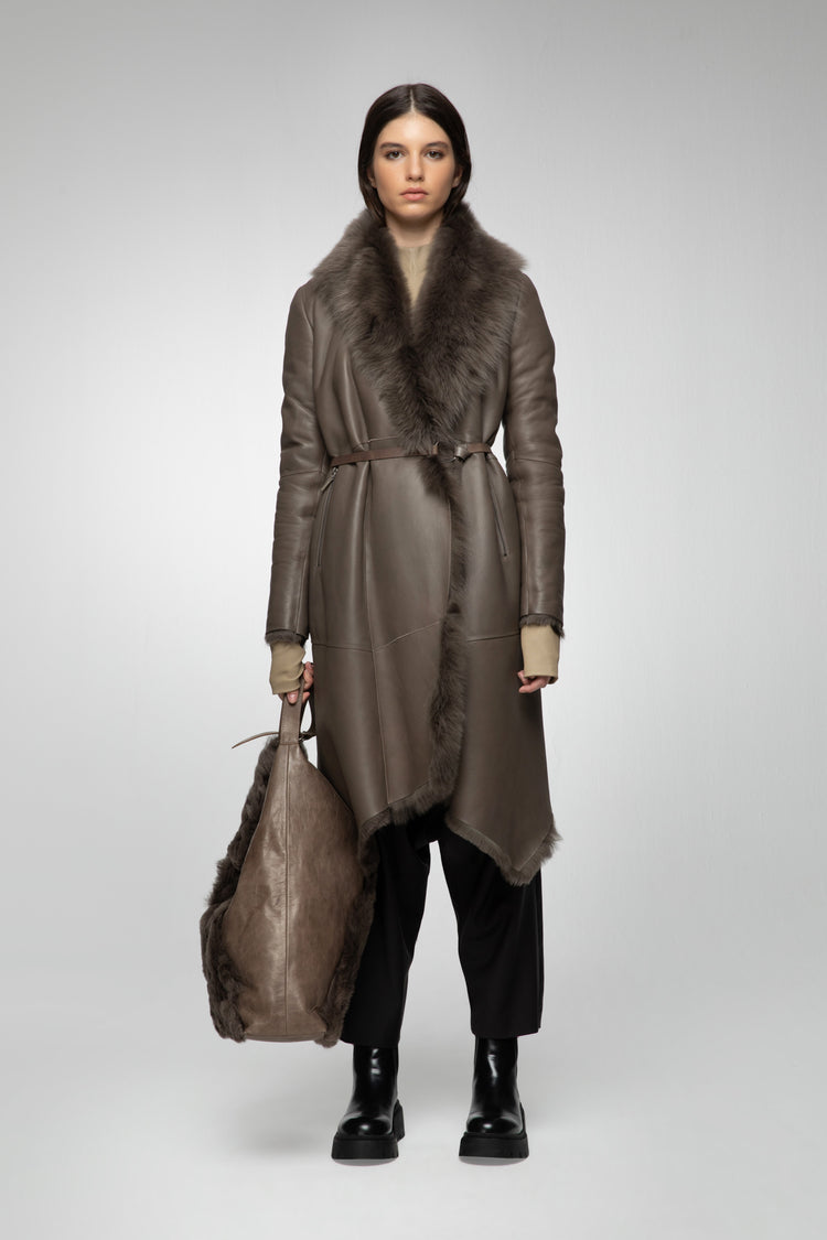 • Véritable pièce intemporelle, ce manteau enveloppant est confectionné en peau d'agneau légère, avec un grand col.