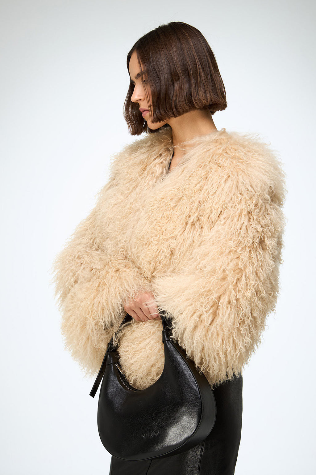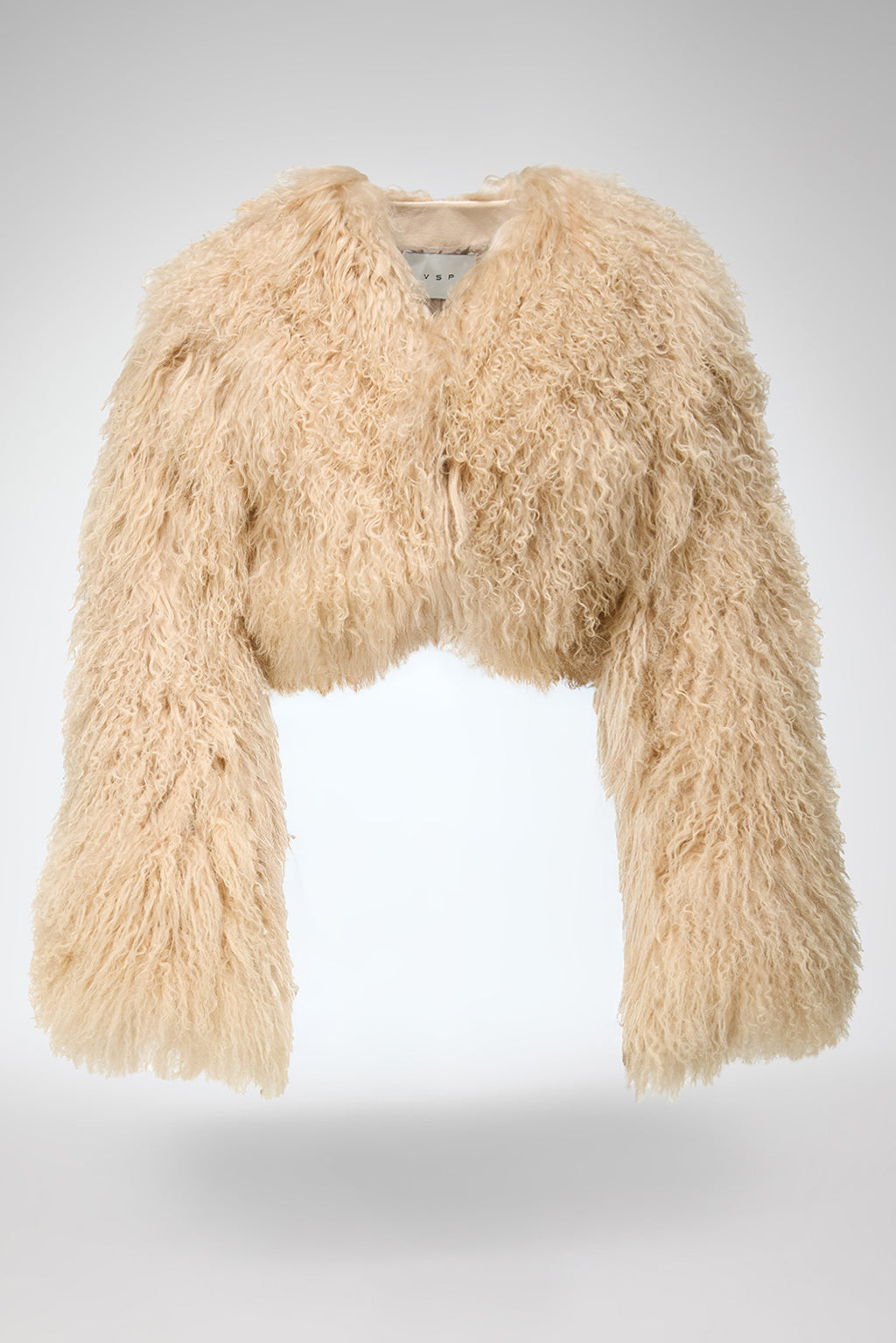 Crafted from plush Mongolian sheepskin, super cropped length jacket with hook fastening closure. Regular fit.