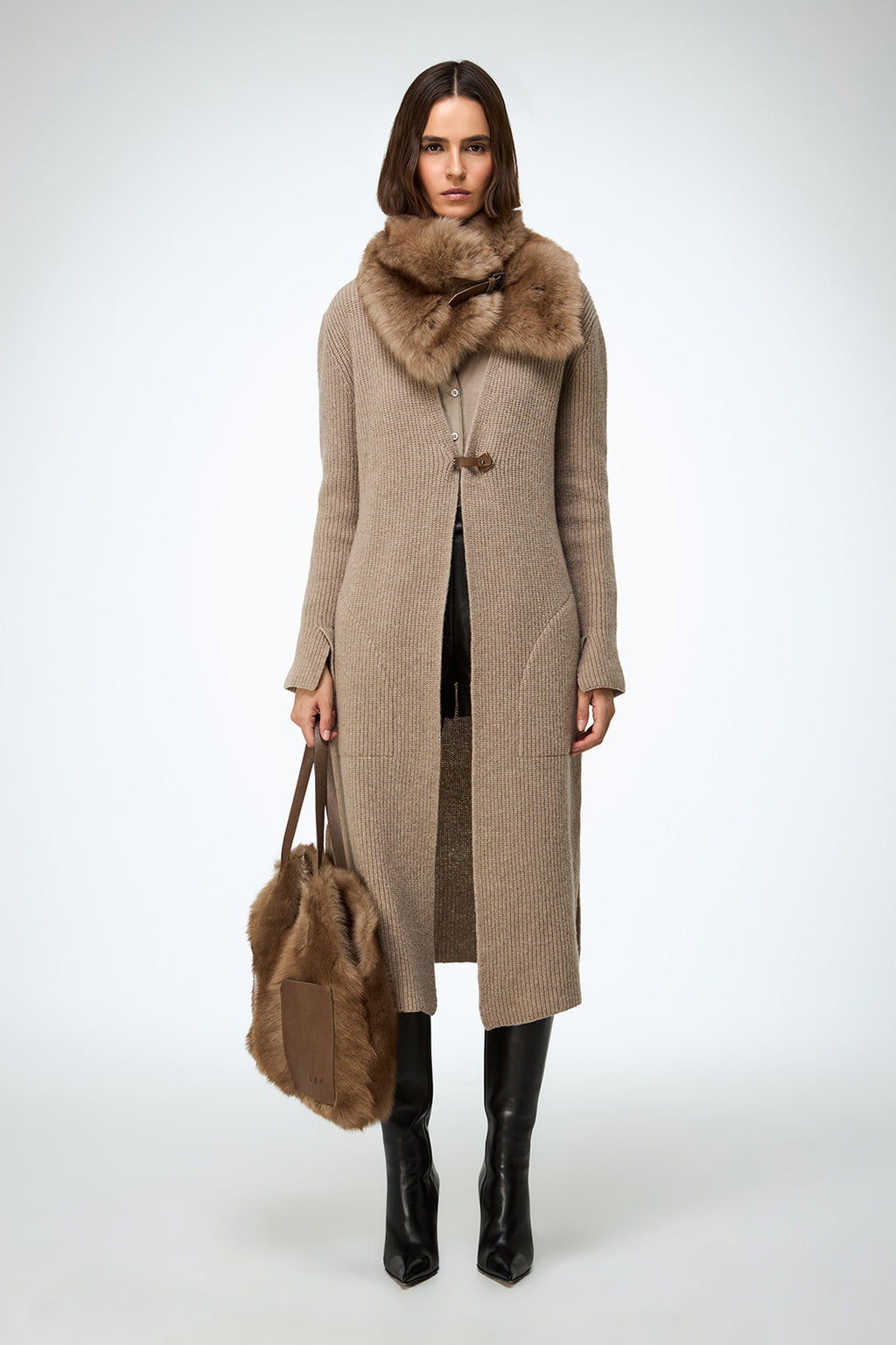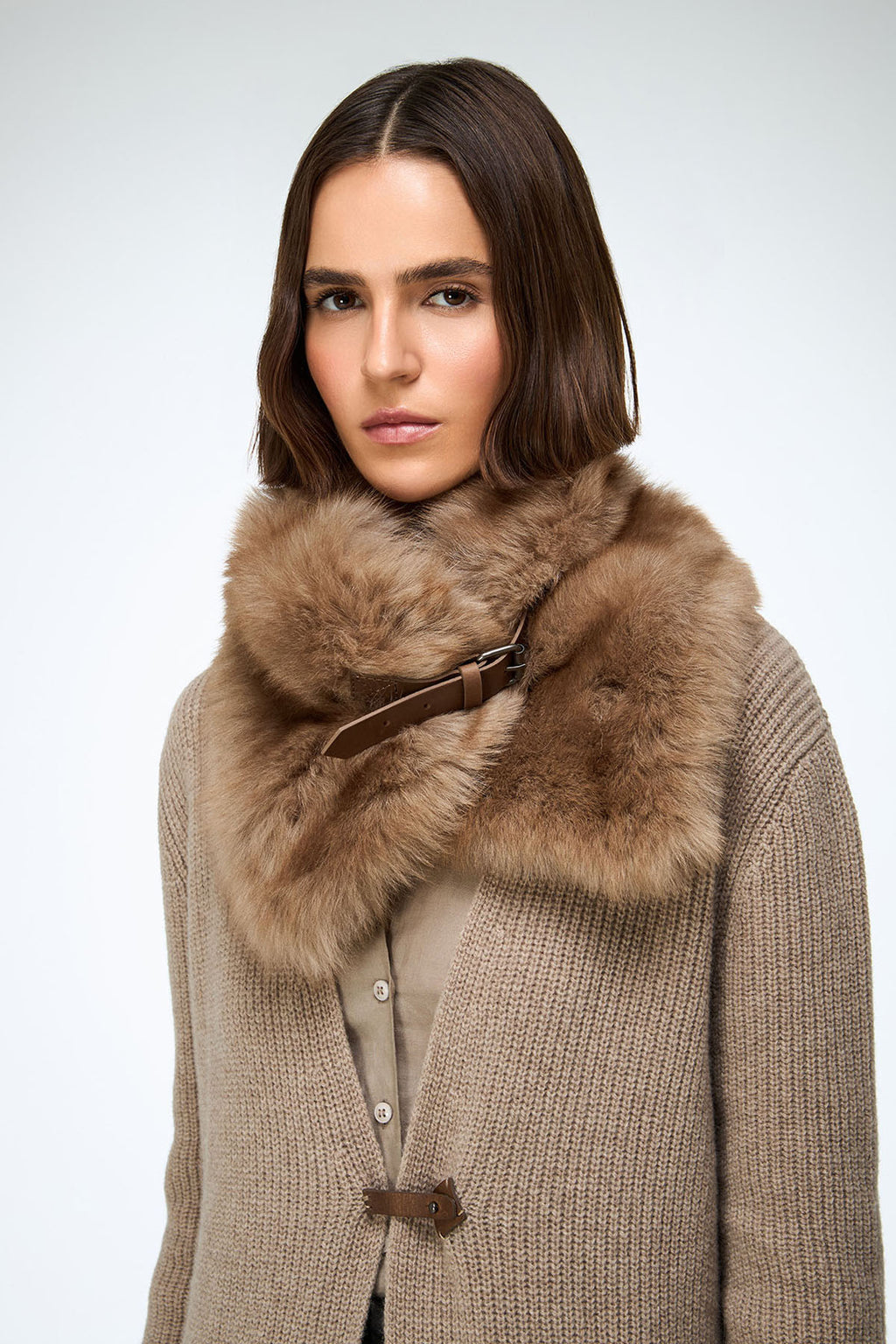 Shearling neck warmer accessory with leather belt fastening.