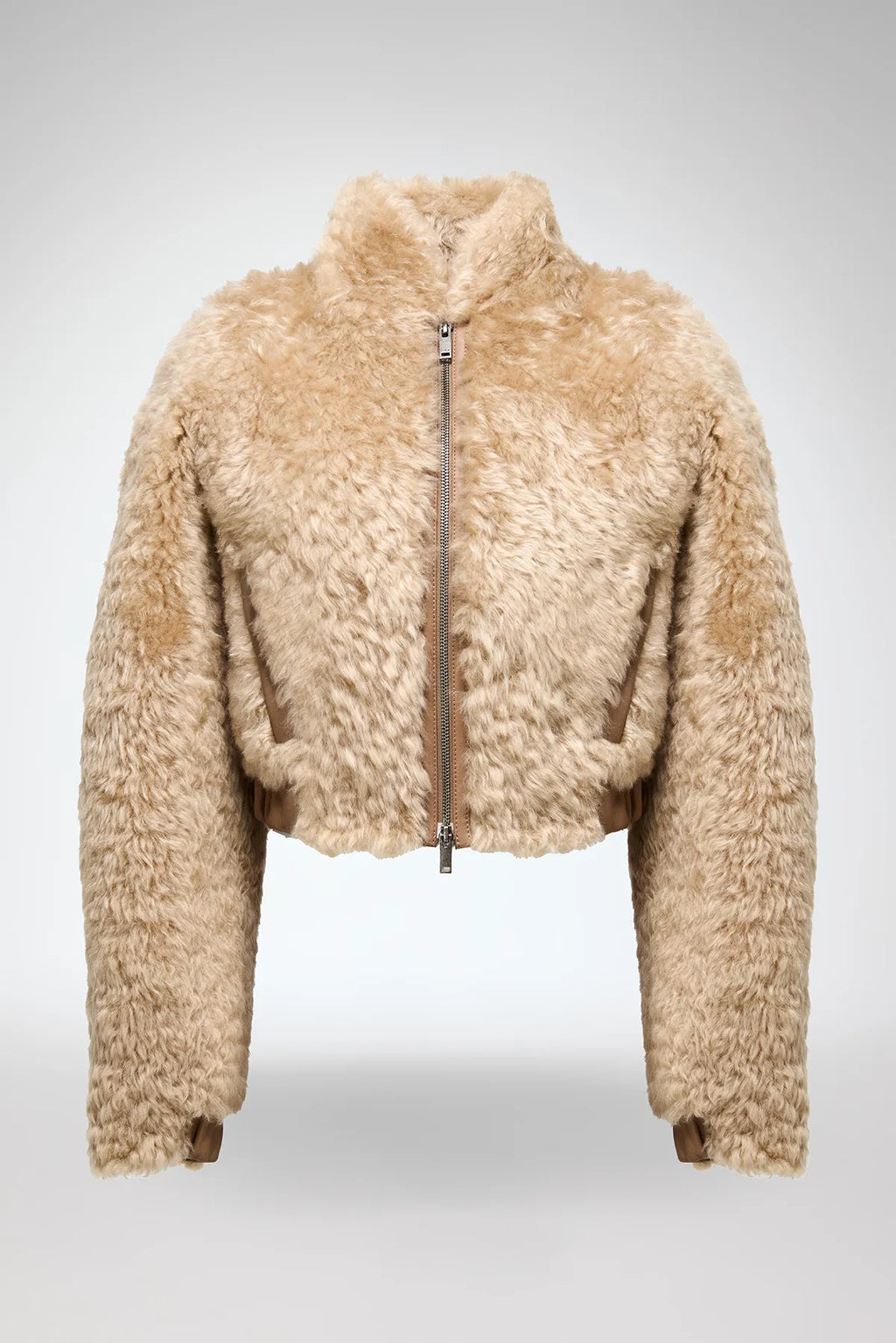 Cropped shearling bomber jacket with double-sided front zipper and leather detailing. Elasticated waist. Side pockets. Regular fit