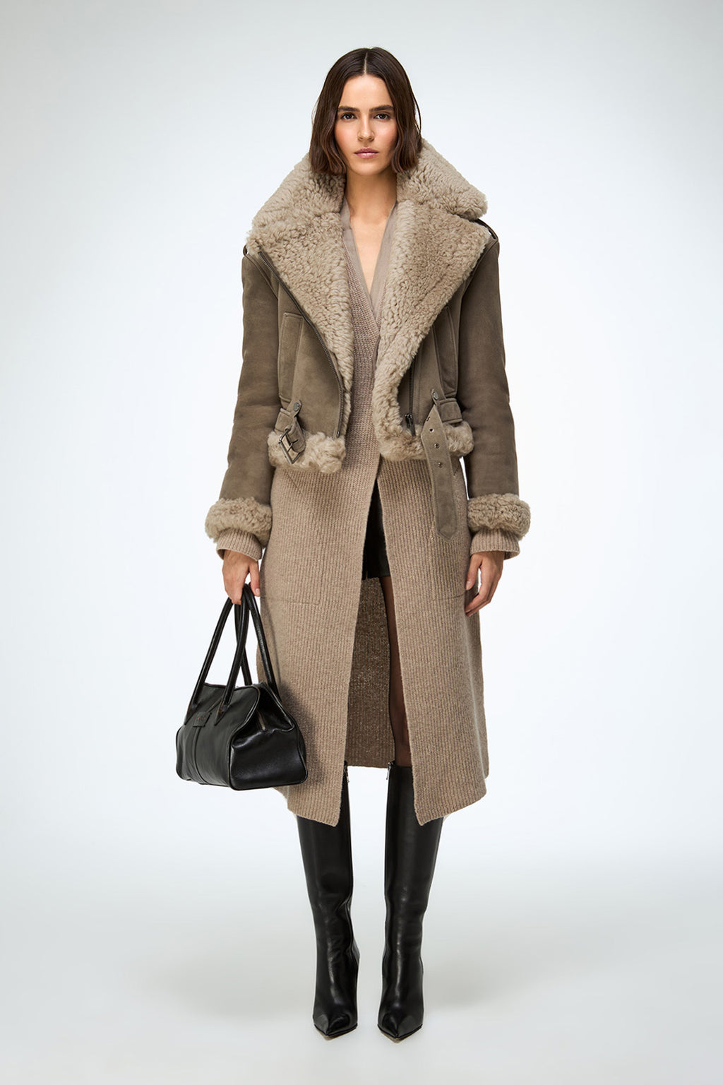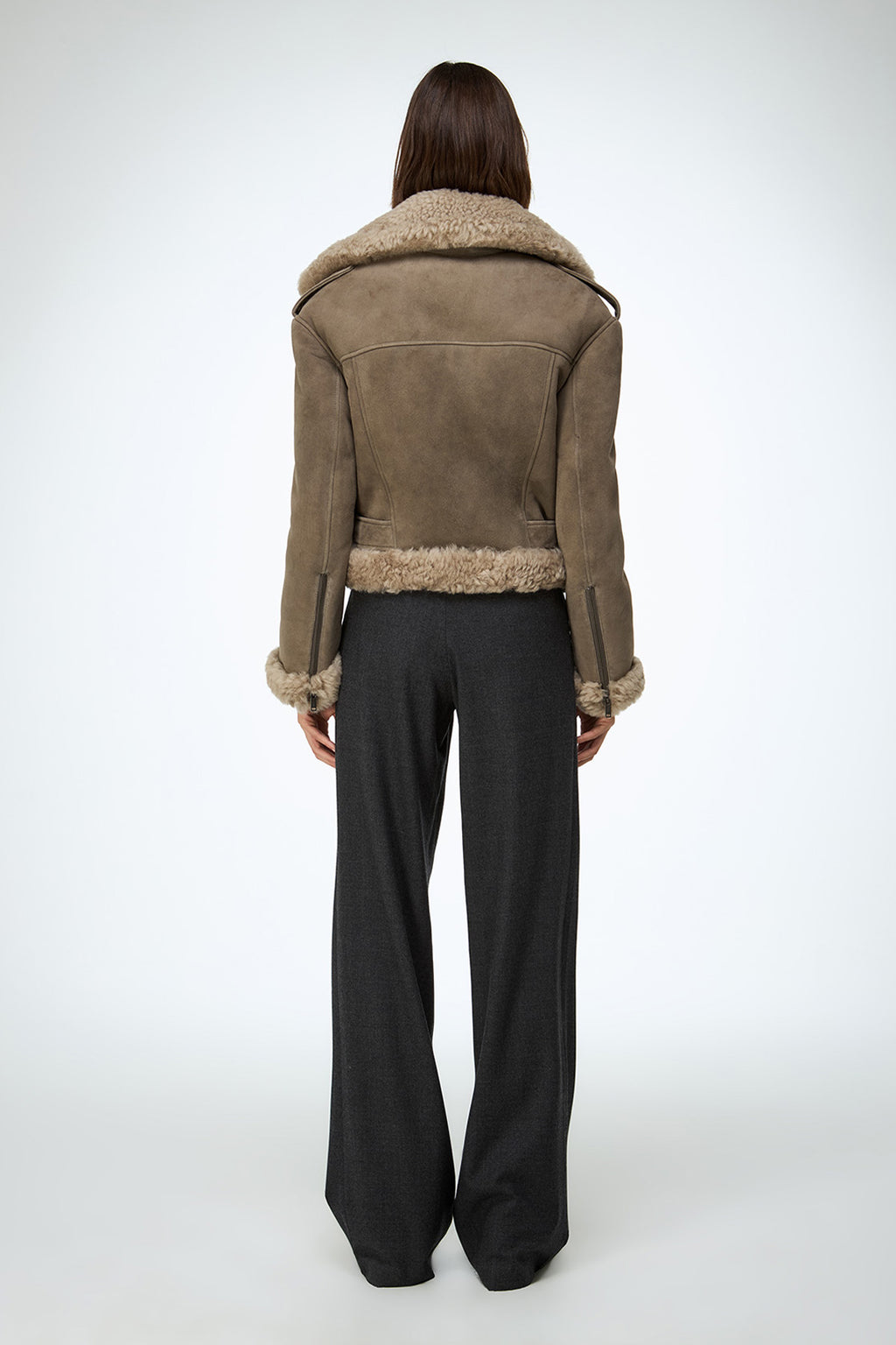 Cropped biker-style jacket, regular fit. Shoulder flaps, side pockets, and buckled belt hemline. Fur trimmings on cuffs and hemline.