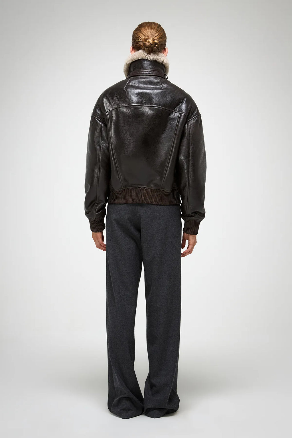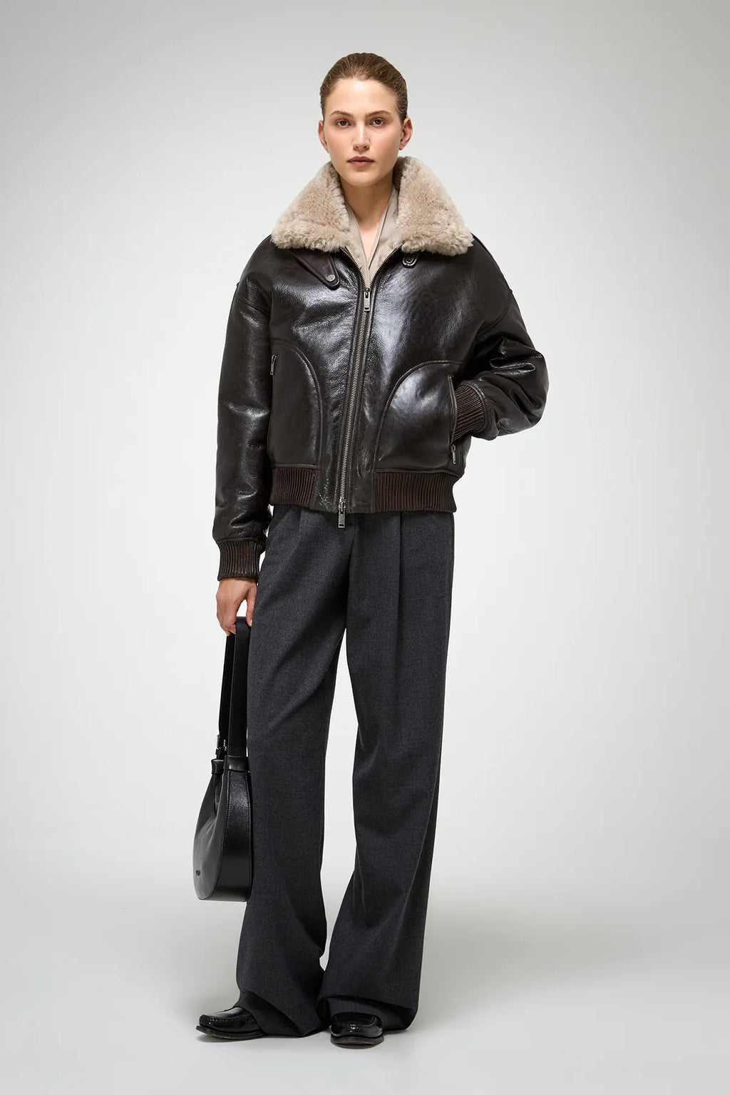 Regular fit cropped shearling jacket. Suede exteriror with shearling collar, side pockets and detachable leather neck belt detail. Double-sided zipper closure.Elasticated hemline and cuffs for a sporty look.